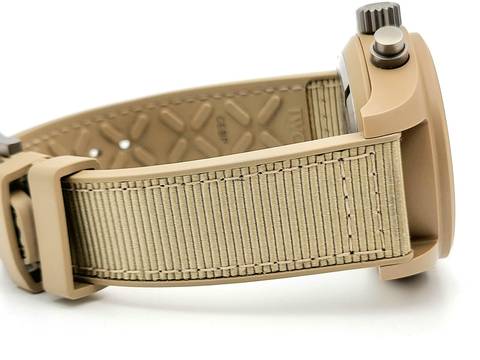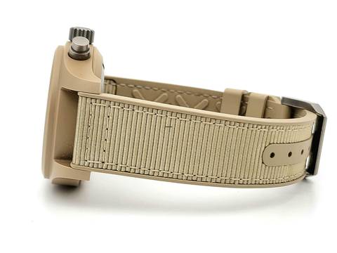For sale is this nice IWC Top Gun Mojave Chronograph 41 mm. Ceramic with a brown dial and ceramic bezel on a textile strap with pin buckle.