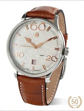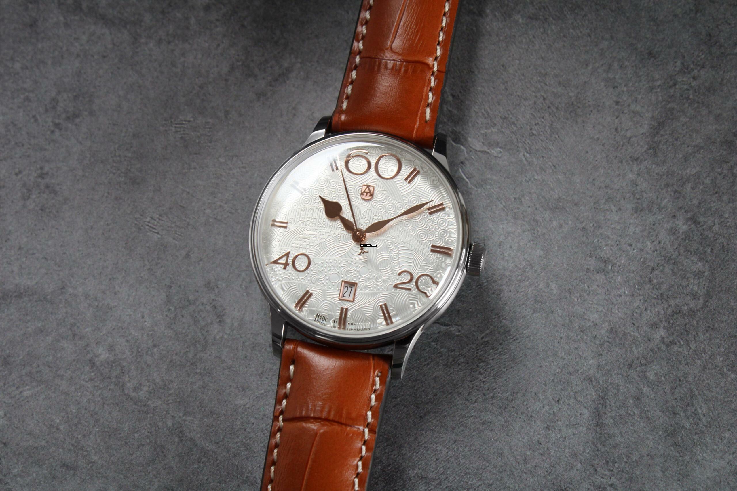 Echtes Lederband in Braun, mit heller Ziernaht und gravierter Massivstahl-Dornschließe