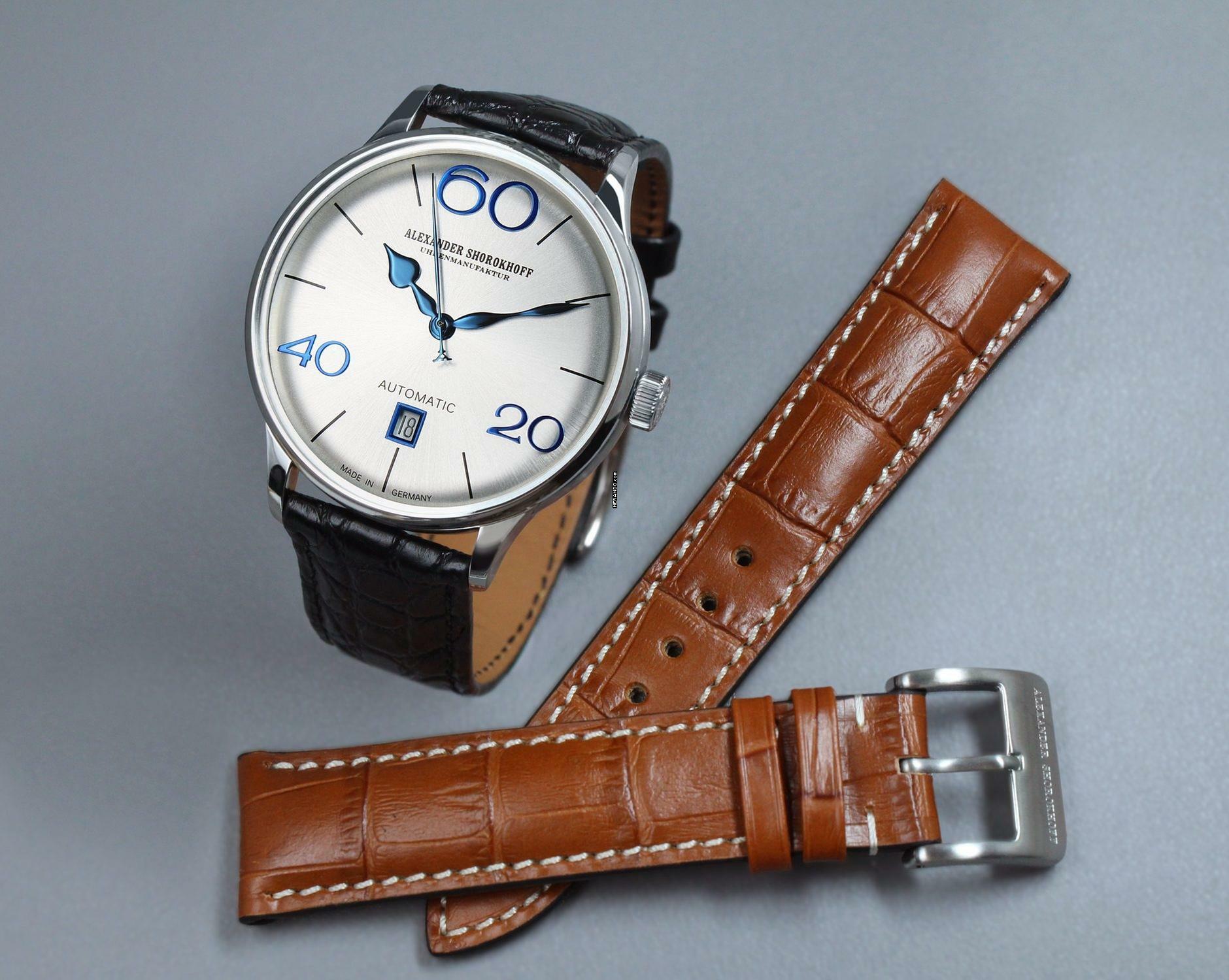 Echtes Alligatorlederband in Schwarz mit gravierter Massivedelstahl-Dornschließe und zusätzliches Kalbslederband in Braun