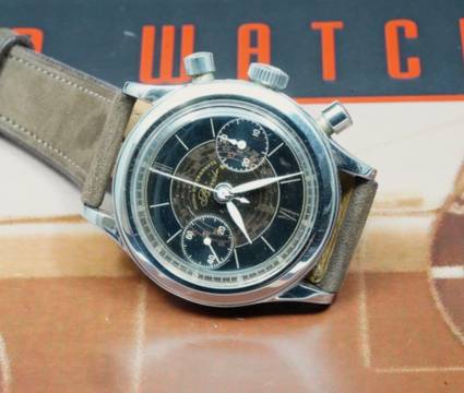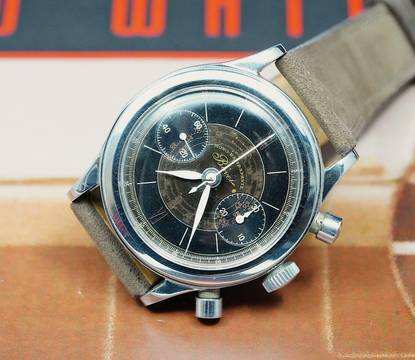 Es ist schwer, die Schönheit und Seltenheit dieser Uhr zu beschreiben!!! Diese Bovet Mono Rattrapante aus den 1940er Jahren ist einfach umwerfend, denn sie hat das seltenste und schönste Zifferblatt, das ich je bei einer Bovet gesehen habe! Schwarz und Grau mit Silber-, Gold- und Kupferdruck und super eleganten weißen Stahlzeigern. Das Gehäuse ist ebenfalls sehr schön, da es sich um die große wasserdichte Version mit großen Drückern (ähnlich wie bei Vetta, Omega 33.3 und Longines) handelt und ohne Krone einen Durchmesser von 38 mm hat. Das Uhrwerk ist Bovets Adaption des Valjoux 84 mit Mono-Rattrapante-Funktion. Im Lieferumfang enthalten ist ein handgefertigtes Wildlederarmband im Stil der damaligen Zeit. Dies ist eine einmalige Gelegenheit, die schönste Bovet Mono Rattrapante zu erwerben...