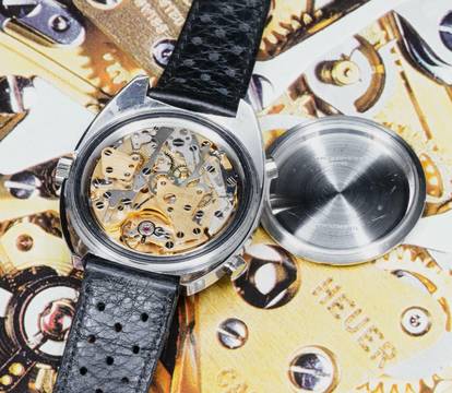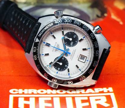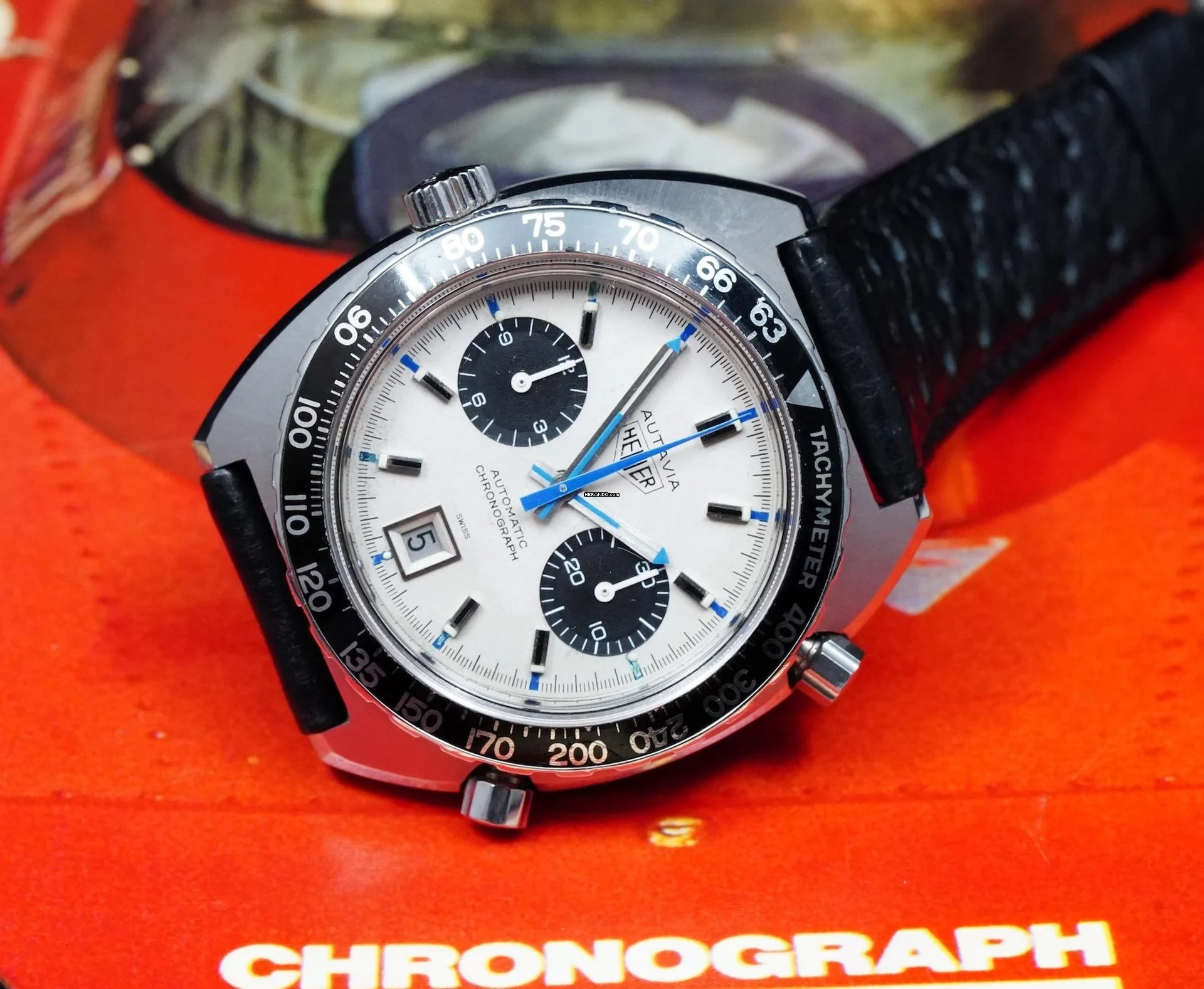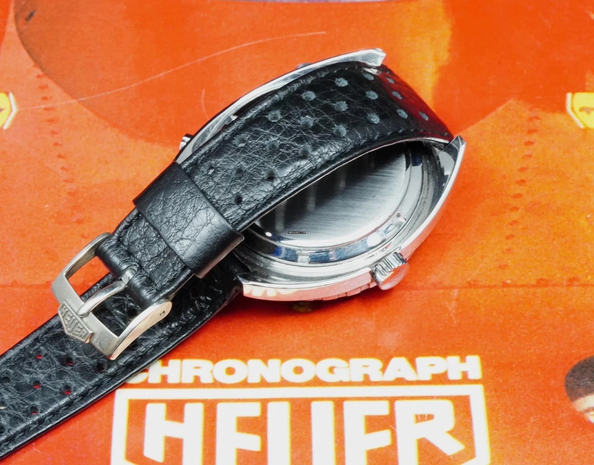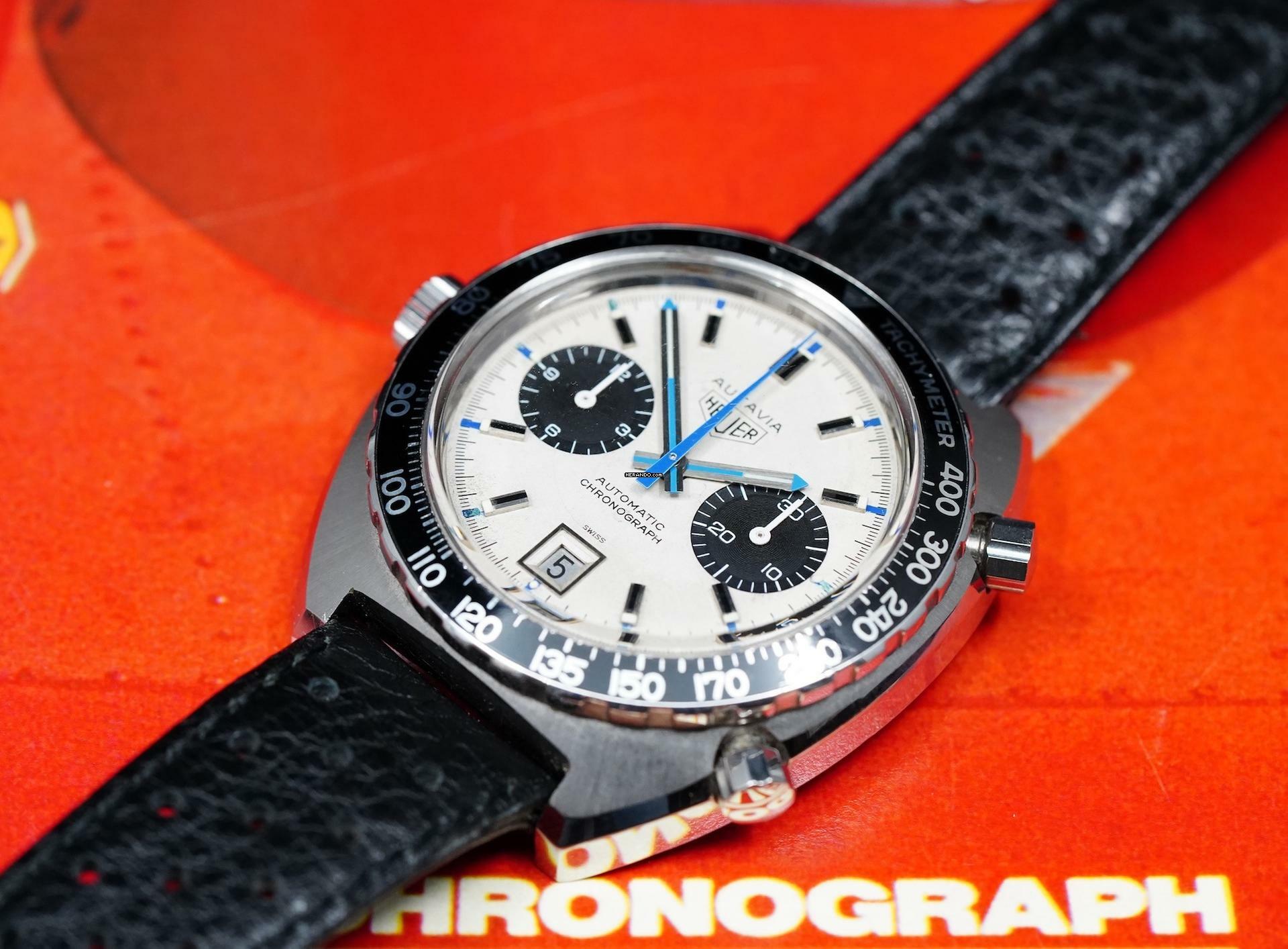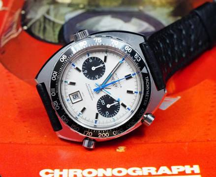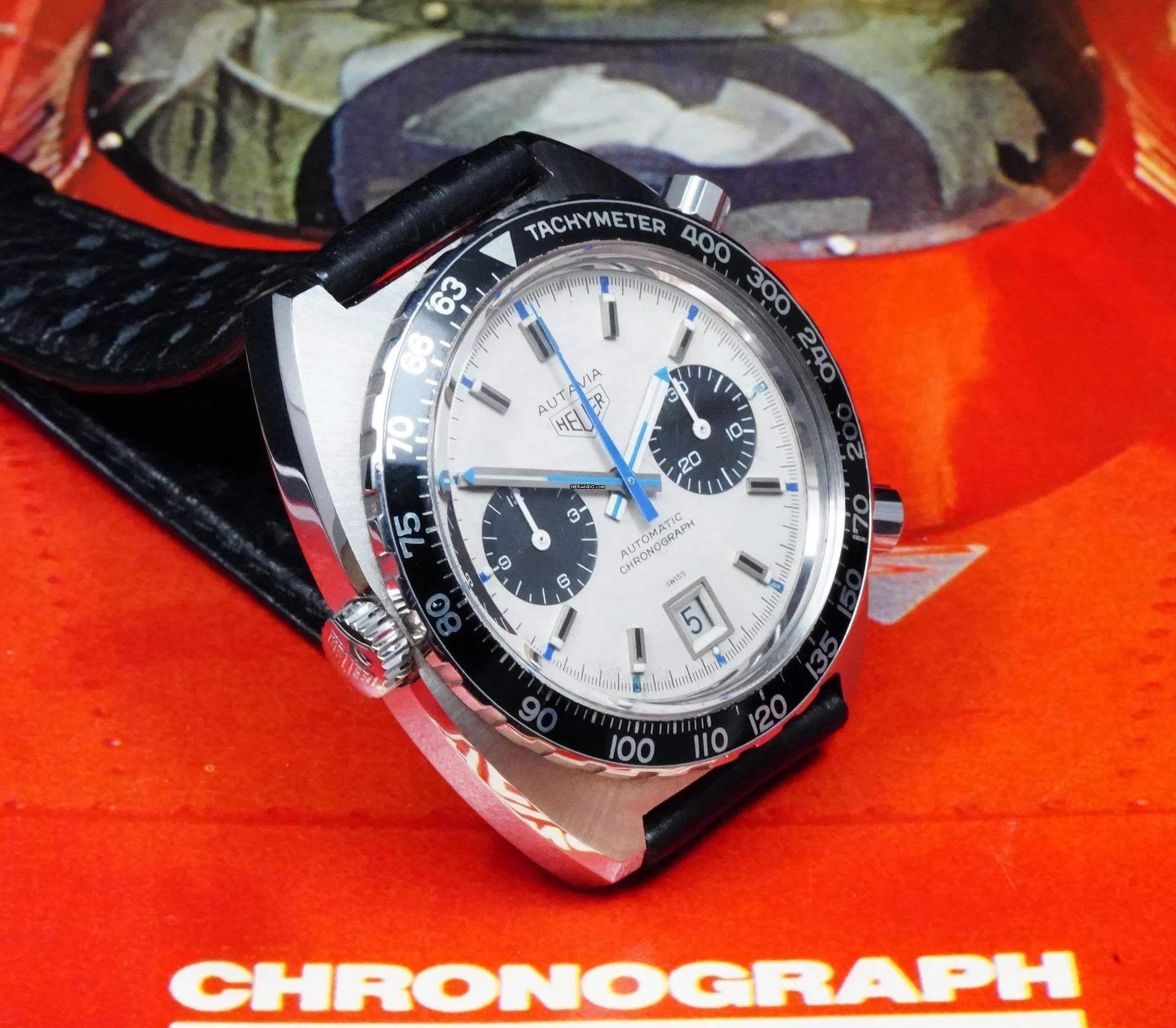 Hier ist eine der bekanntesten Vintage-Uhren von Heuer: die Autavia Automatic „Jo Siffert“, benannt nach dem berühmten Formel-1-Fahrer, der diese Uhr trug, als sie neu war. Für mich ist sie die schönste Autavia aufgrund ihres strahlend weißen Zifferblatts und der blauen Details, die sie deutlich von den Versionen mit schwarzem Zifferblatt abheben. Das hier gezeigte Exemplar ist eine wunderschöne, vollständig originale MK5 mit den markanteren blauen Zeigern. Das große Gehäuse mit Schraubverschluss ist in ausgezeichnetem Zustand und verfügt über originale Drücker und Krone. Das originale Zifferblatt ist nur leicht gealtert und die schöne weiße Farbe kommt am Handgelenk besonders gut zur Geltung. Das Uhrwerk ist das berühmte Heuer/Buren Cal 12 Automatic, das einwandfrei funktioniert. Im Lieferumfang enthalten ist ein originales Heuer-Armband mit Schnalle. Außerdem wird eine Heuer Autavia-Kartonbox mitgeliefert. Ein toller, cooler Rennsport-Chronograph zu einem sehr guten Preis!