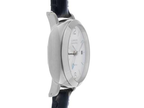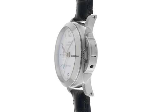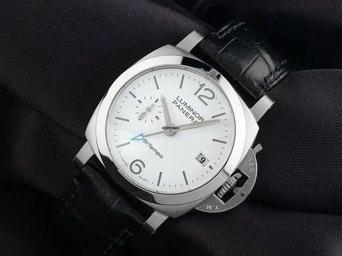 Panerai Luminor Quaranta BiTempo GMT Stahl Automatik Armband Leder Gehäuse Edelstahl satiniert, Gehäusedurchmesser ohne Krone 40mm, Gehäusehöhe 13,8mm. Lünette Edelstahl poliert. Panerai Armband Leder schwarz mit Ziernaht, Anstoßbreite 22mm, Panerai Stiftschließe Edelstahl mit Hersteller-Logo. Zifferblatt weiß mit Leuchtindexen, arabischen Leuchtziffern und Edelstahl Leuchtzeigern. Uhrwerk Automatik, Manufakturkaliber P.900/GMT mit 23 Edelsteinen, Gangreserve ca. 72 Stunden. Anzeige von Stunde und Minute über Zeiger aus der Mitte, kleine Sekunde mit Sekundenstopp zur sekundengenauen Einstellung der Uhrzeit bei 9 Uhr, Datumsanzeige mit Schnellverstellung bei 3 Uhr, GMT (zweite Zeitzone) ablesbar über Zeiger mit blauer Spitze. Saphirglas kratzfest und gewölbt. Krone mit patentiertem Panerai Schutzbügel. Boden Edelstahl verschraubt und graviert mit Saphirglas Sichtfenster. Gewicht der Uhr inklusive Armband 101g. Wasserdicht bis 10 ATM. Referenznummer: PAM01367, ID: ST1160135020125H-9300, Artikelnummer: 10000077978. Original Panerai Box mit Umkarton und Garantie Papiere von Januar 2025 sowie Wechselarmband, Full Set. Ungetragen, Neuheit. Lieferzeit sofort.