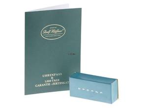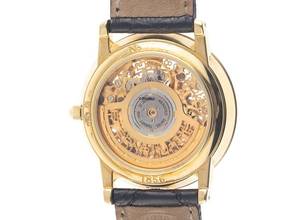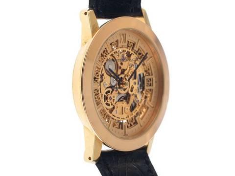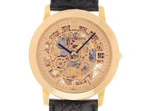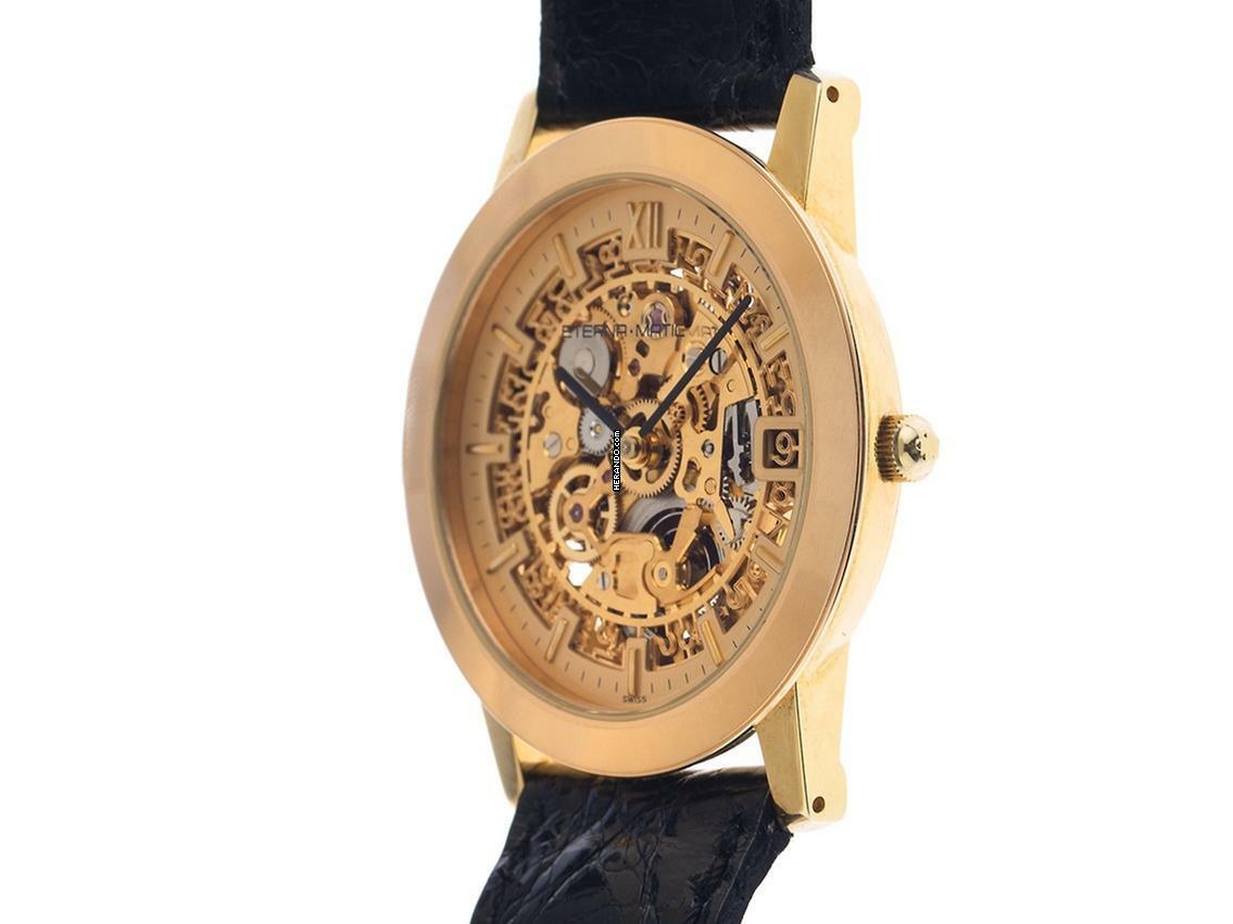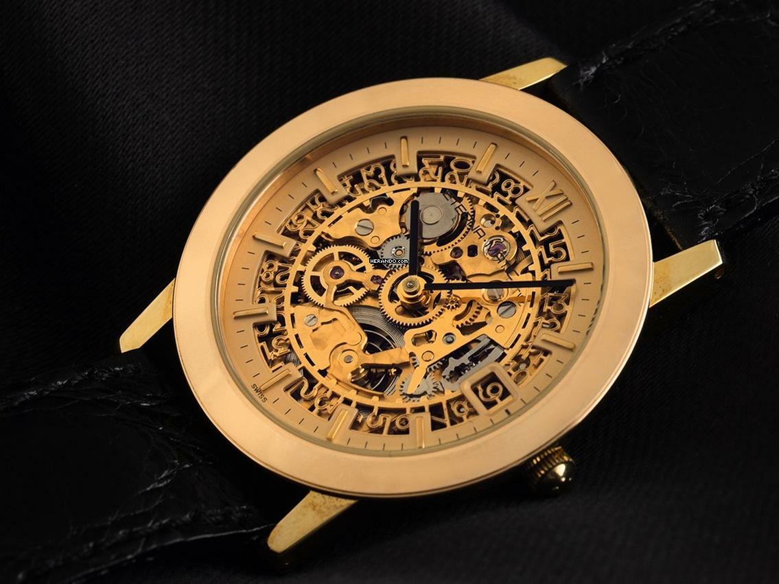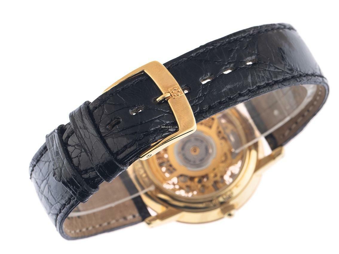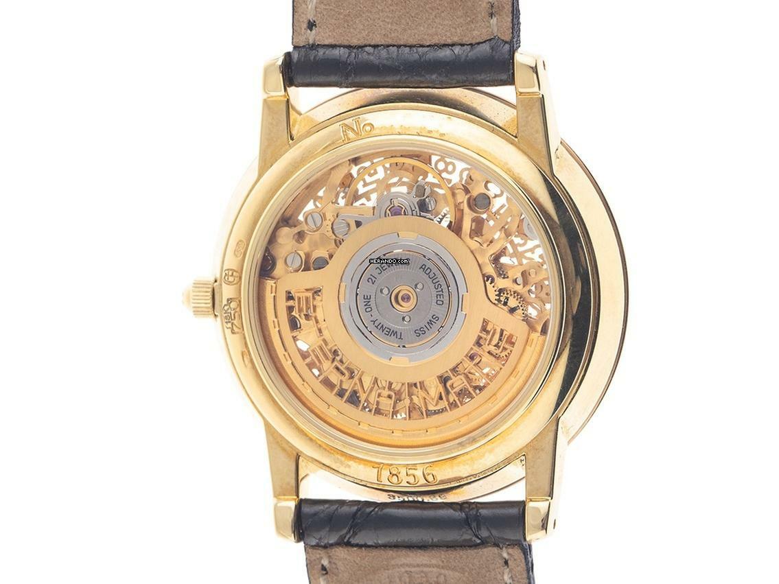 Eterna 1856 Skeleton 18kt Gelbgold Automatik Armband Leder Gehäuse 18kt Gelbgold poliert, Gehäusedurchmesser ohne Krone 34mm, Gehäusehöhe 7,4mm. Armband Krokoleder schwarz mit Ziernaht, Anstoßbreite 18mm, Stiftschließe Gelbgold vergoldet mit Hersteller-Logo. Zifferblatt skelettiert mit aufgesetzten gelbgoldenen Indexen und schwarzen Zeigern. Uhrwerk Automatik, Kaliber ETA 2829 mit 21 Edelsteinen. Anzeige von Stunde und Minute über Zeiger aus der Mitte, Datumsanzeige mit Schnellverstellung bei 3 Uhr. Saphirglas kratzfest. Krone mit Hersteller-Logo. Boden 18kt Gelbgold graviert mit Saphirglas Sichtfenster. Gewicht der Uhr inklusive Armband 44g. Referenznummer: 7856, Gehäusenummer: XXX, ID: ST548947600325H-6500, Baujahr: 1992, Artikelnummer: 10000079247. Mit Gangkontrolle und kompletter äußerlicher Aufarbeitung von März 2025, inkl. 1000 Tage Garantie. Original Eterna Box und Uhrenpass. Limitiert auf 499 Exemplare. Superschnäppchen, Kapitalanlage mit Wertsteigerungspotential, extrem seltenes Sammlerstück. Wie Neu. Lieferzeit sofort.
