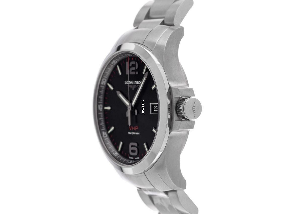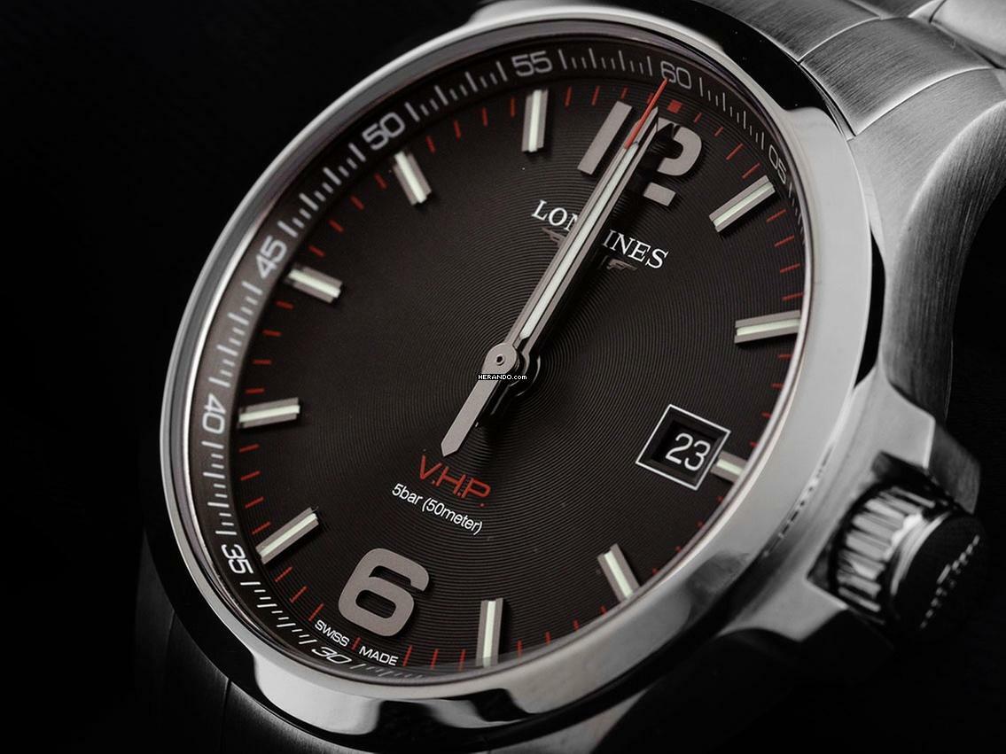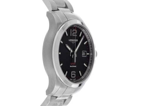Longines Conquest V.H.P. Stahl Quarz Armband Stahl Gehäuse Edelstahl satiniert, Gehäusedurchmesser ohne Krone 43mm, Gehäusehöhe 12,5mm. Lünette Edelstahl glatt und poliert. Armband Edelstahl poliert und satiniert, verdeckte Doppelsicherheitsfaltschließe Edelstahl mit Hersteller-Logo. Zifferblatt schwarz mit aufgesetzten Leuchtindexen, arabischen Ziffern und Edelstahl Leuchtzeigern. Uhrwerk quarzgesteuert, Kaliber L288. Anzeige von Stunde, Minute und Sekunde über Zeiger aus der Mitte mit Sekundenstopp zur sekundengenauen Einstellung der Uhrzeit, Datumsanzeige mit Schnellverstellung bei 3 Uhr. Saphirglas kratzfest. Krone mit Flankenschutz und Hersteller-Logo. Boden Edelstahl verschraubt und graviert. Gewicht der Uhr inklusive Armband 180g, Länge des Armbandes inklusive Gehäuse 205mm. Referenznummer: L3.726.4.56.6, ID: ST116016700425H-1150, Artikelnummer: 10000080000. Original Longines Box mit Umkarton und Garantie Papiere von 2025, Full Set. Ungetragen. Lieferzeit sofort.