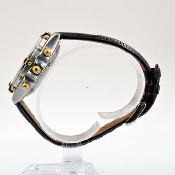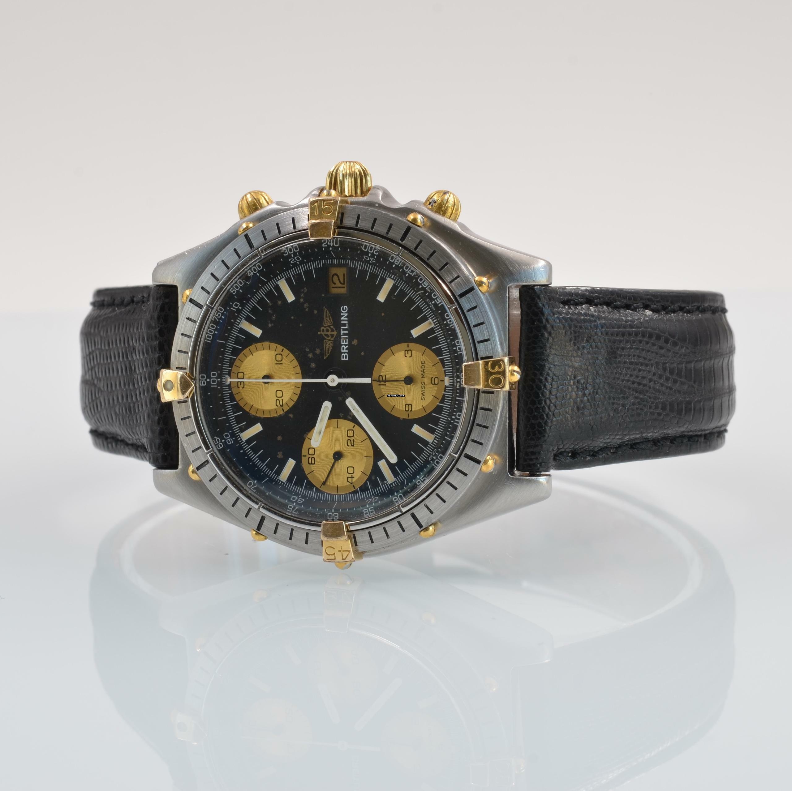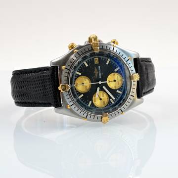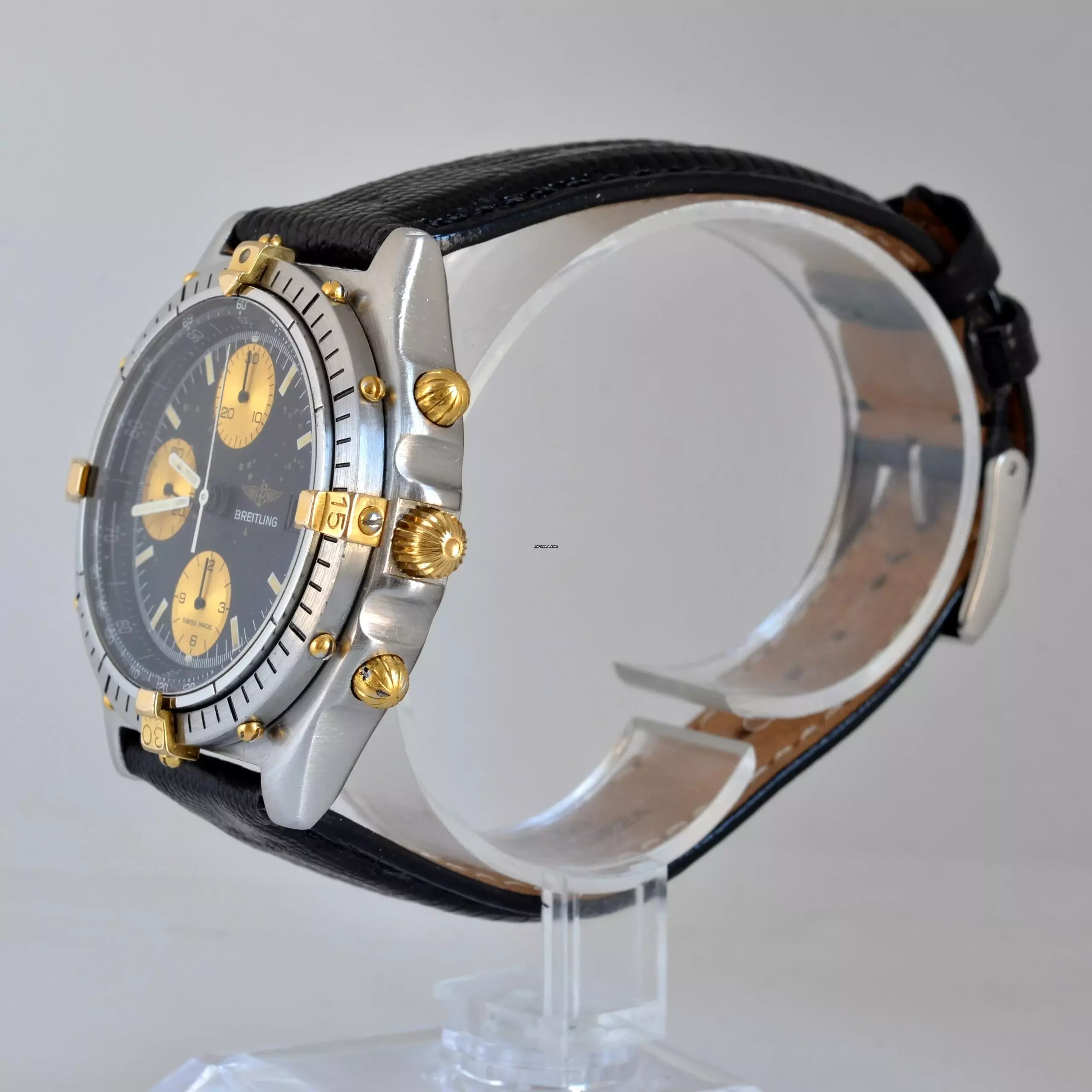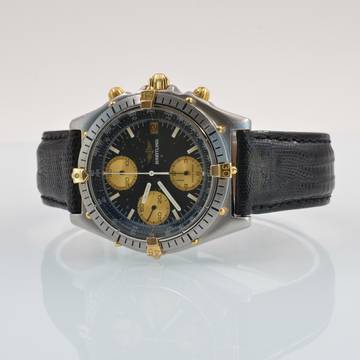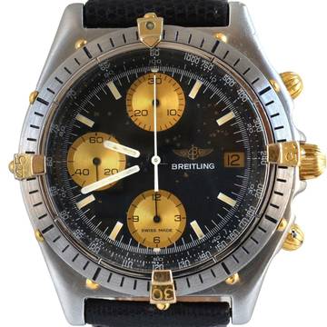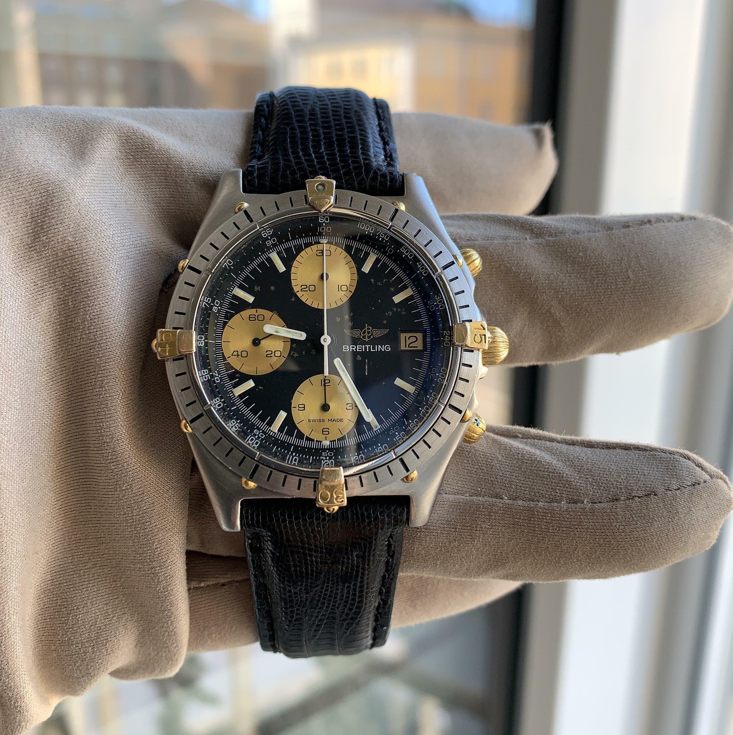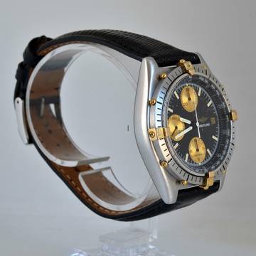 Breitling Chronomat chronograph steel, year of production 1988, unidirectional steel bezel with golden knights, sapphire glass anti-reflective, black colour dial with date to three vertical counters, indexes and hands to tritium, automatic winding mechanical movement, alligator matte black colour strap with steel original Breitling.
