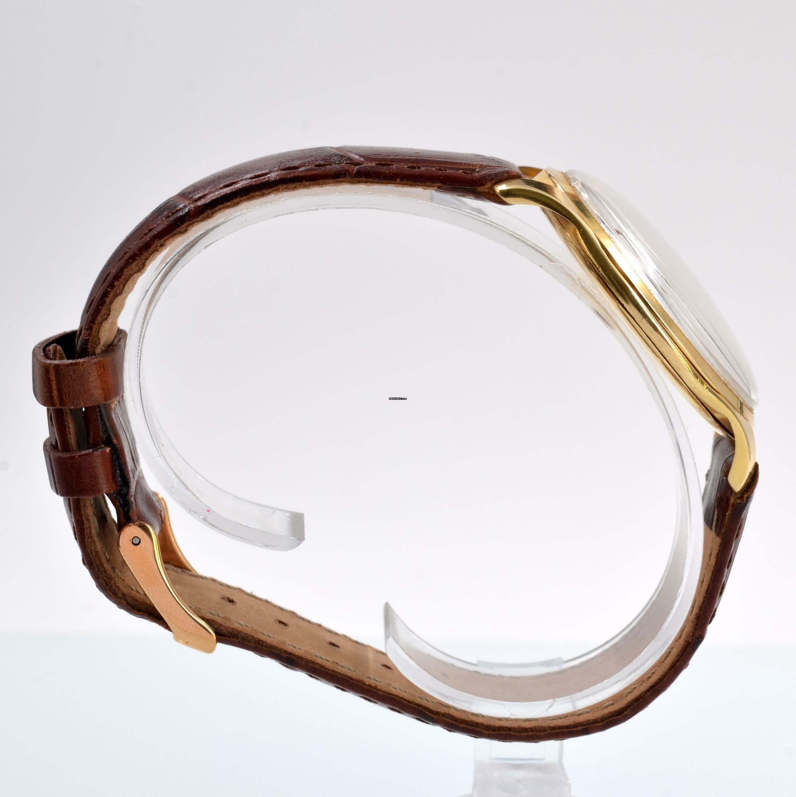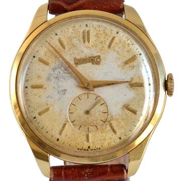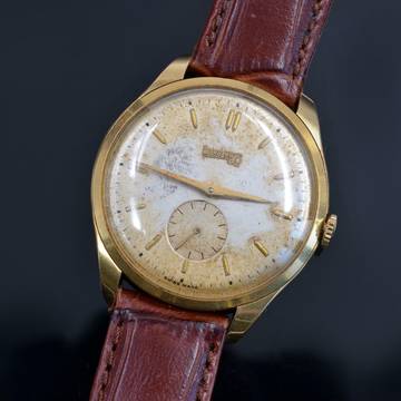 Eberhard & Co. oversize Classic vintage with small seconds yellow gold 18KT, year of production 1940 about, smooth yellow gold 18KT bezel, domed plastic glass, champagne colour dial with small seconds counters at 06:00, original from the epoch, never retouched or reprinted, manual winding mechanical movement, calfskin leather alligator print strap brown colour with generic golden buckle.