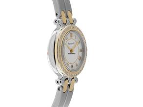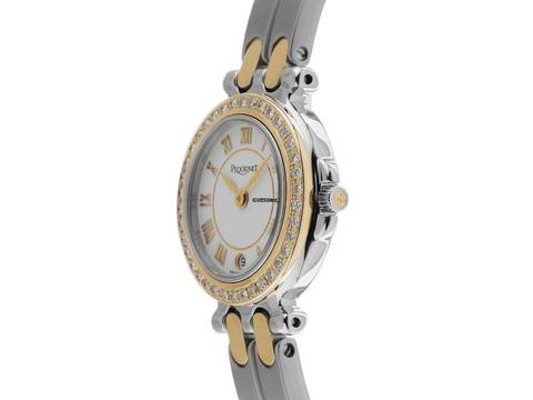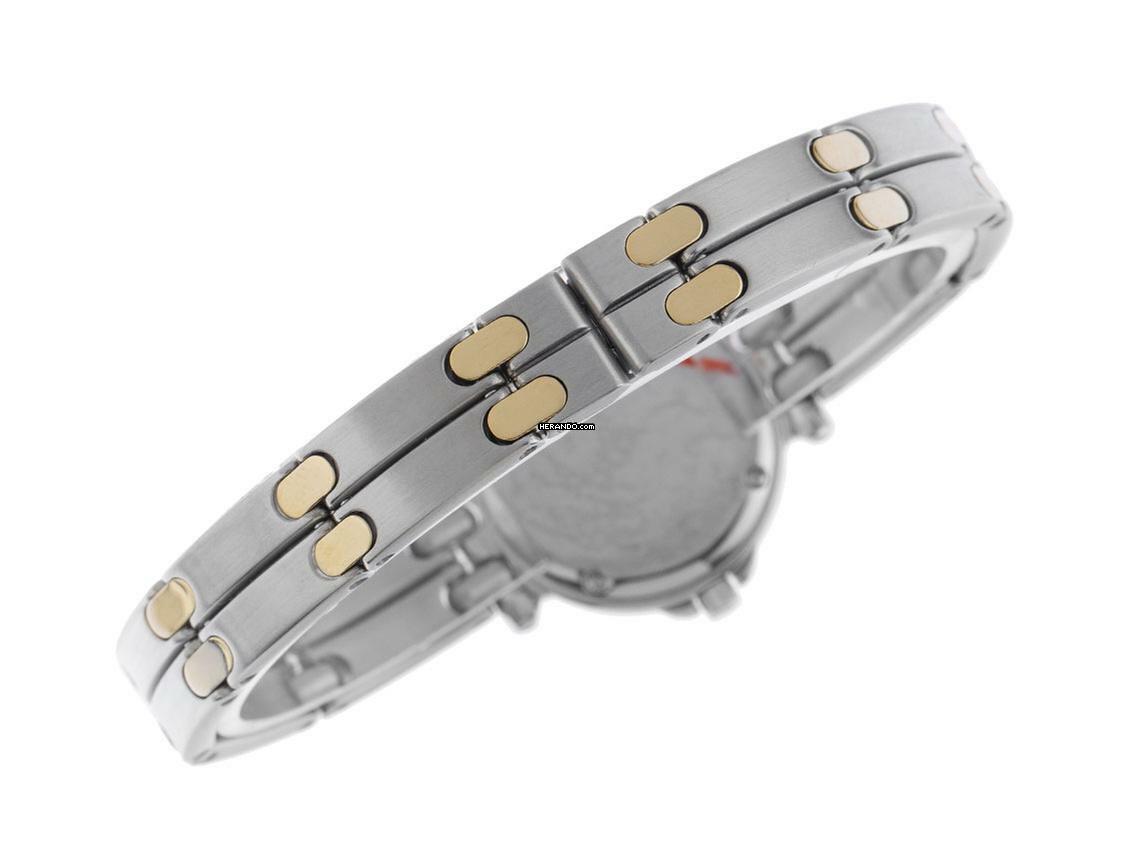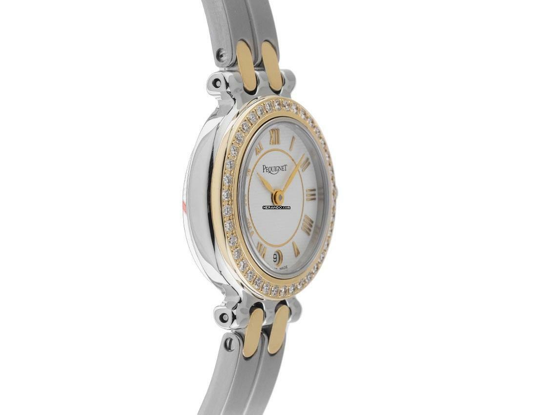 Pequignet Moorea Stahl Gelbgold Quarz Armband Stahl Gelbgold Gehäuse Edelstahl poliert, Gehäusedurchmesser ohne Krone 24mm, Gehäusehöhe 6,1mm. Lünette Gelbgold vergoldet mit Diamanten besetzt, zusammen ca. 0,76ct TW / VSI (feines Weiß mit sehr kleinen Einschlüssen). Armband Edelstahl / Gelbgold vergoldet, poliert und satiniert, verdeckte Doppelfaltschließe Edelstahl. Zifferblatt weiß mit aufgesetzten gelbgoldenen römischen Ziffern und gelbgoldenen Zeigern. Uhrwerk quarzgesteuert, Kaliber 955112 mit 7 Edelsteinen. Anzeige von Stunde und Minute über Zeiger aus der Mitte. Saphirglas kratzfest. Krone mit Flankenschutz und Hersteller-Logo. Boden Edelstahl 4-fach verschraubt und graviert. Gewicht der Uhr inklusive Armband 51g, Länge des Armbandes inklusive Gehäuse 180mm. Referenznummer: 7711019, Gehäusenummer: XXX, ID: P19025001125H-2400, Artikelnummer: 10000083146. Mit Gangkontrolle, neuer Batterie und kompletter äußerlicher Aufarbeitung von November 2025. Original Pequignet Box sowie Watchregister Auszug von November 2025, The Watch Register Zertifikat / ohne Eintrag (Internationale Datenbank für verlorene oder gestohlene Uhren). Superschnäppchen. Wie Neu. Lieferzeit sofort. Inklusive certified pre owned Siegel / Uhrenpass mit einem Farbbild, der genauen Beschreibung sowie dem Wiederbeschaffungswert der Uhr über 2400,-€ und 1000 Tage Garantie ab Kaufdatum.