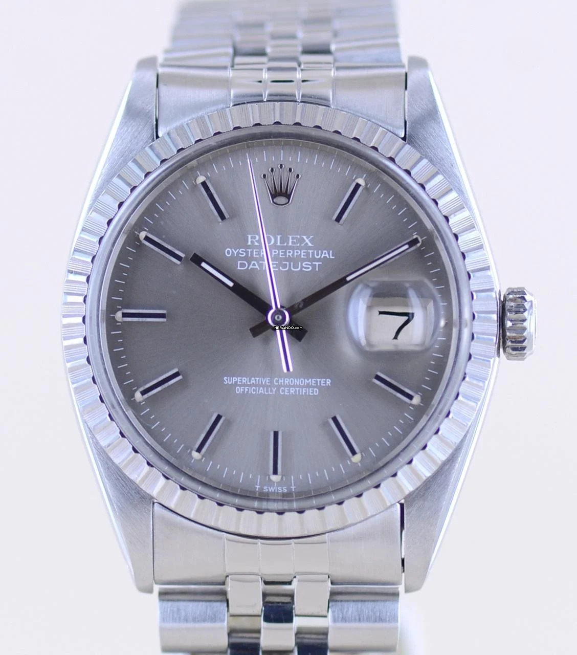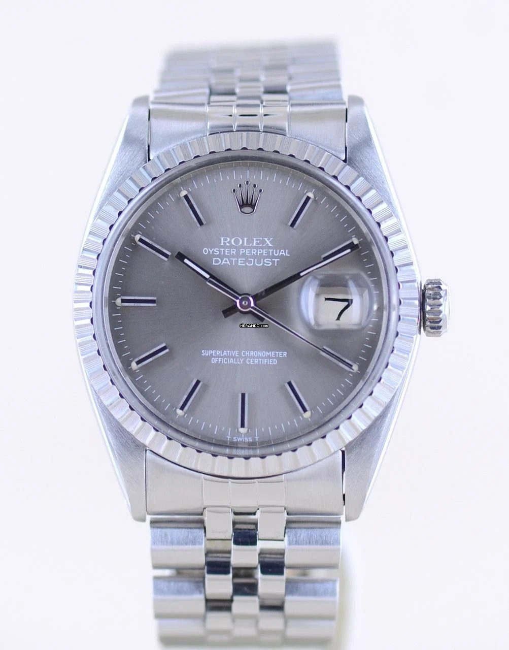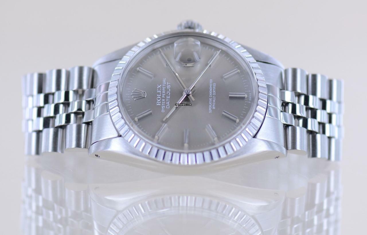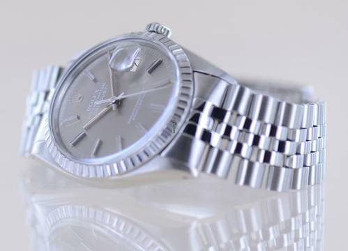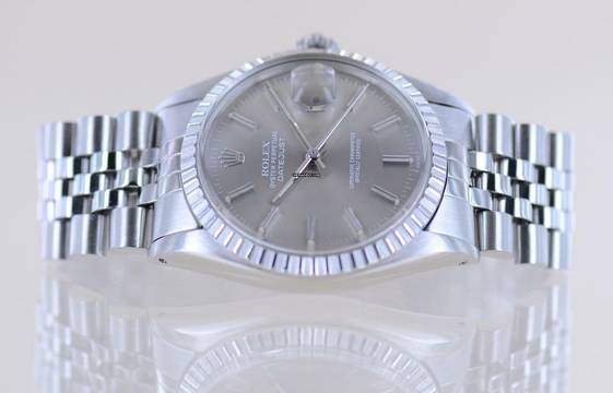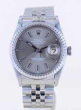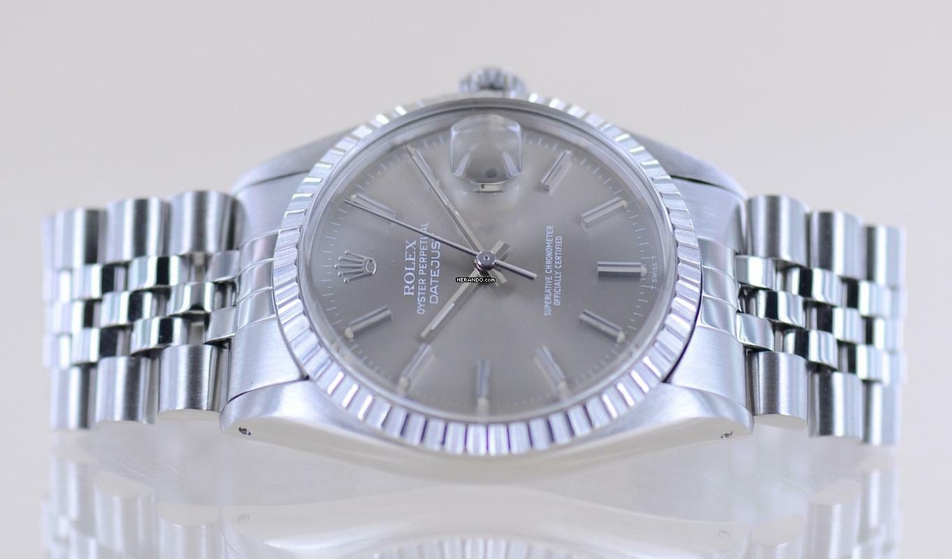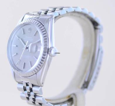 Sehr schöne Rolex Datejust aus dem Baujahr 1977 mit der Referenz 16030. Die mit Seriennummer 569.... beginnende Uhr hat das durchbohrte Gehäuse und ein sehr schönes, grau-silbernes Zifferblatt mit applizierten Indizes. Das Blatt wirkt wunderschön im Sonnenlicht und harmoniert perfekt mit der geriffelten Stahllünette. Diese Uhr ist ein zeitloser Klassiker und das Zifferblatt wirkt unter dem Plexiglas mit Lupe hervorragend.Die Datejust gehört in jede gute Uhrensammlung, macht jedoch auch im Alltag eine super Figur und hält bei entsprechender Pflege ein Leben lang. Das klare Zifferblatt ist fernab von jedem Trend zeitlos schön und wird es auch immer bleiben.