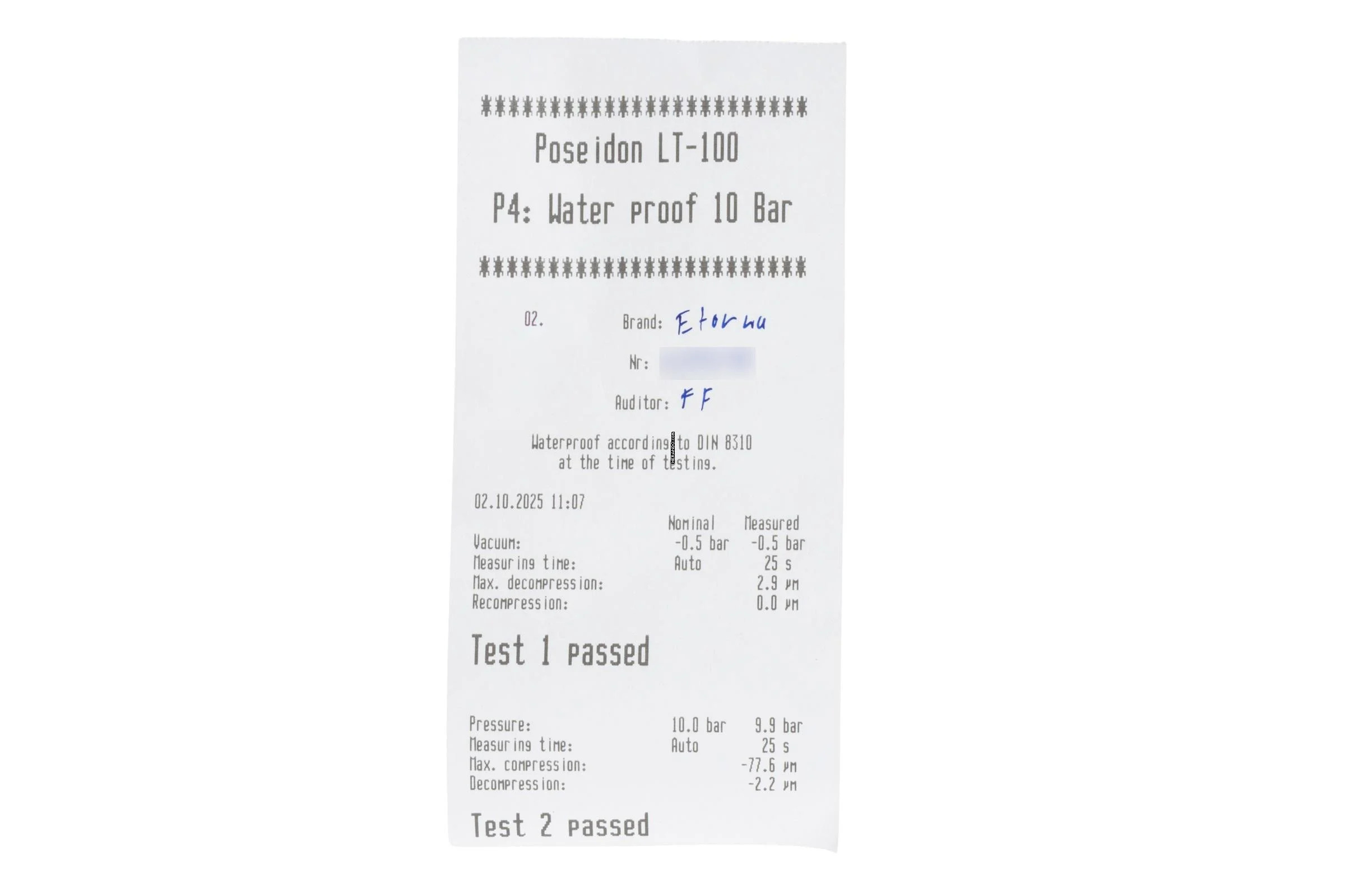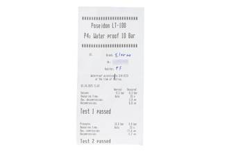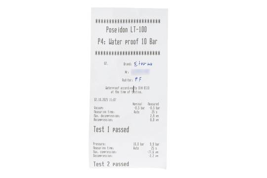 * Wenn die Uhr positiv auf Wasserdichtigkeit getestet wurde, dann gilt diese Eigenschaft zum Zeitpunkt der Messung. Wasserdichtigkeit ist nach DIN 8310 keine bleibende Eigenschaft. Sie sollte jährlich und vor besonderen Belastungen überprüft werden, da die eingebauten Dichtelemente in ihrer Funktion und im täglichen Gebrauch nachlassen. Einflüsse wie starke Temperaturschwankungen, Chlor, Seife oder Salzwasser wirken sich negativ auf die Wasserdichtigkeit aus.