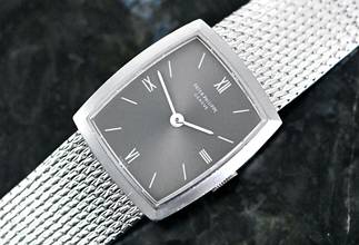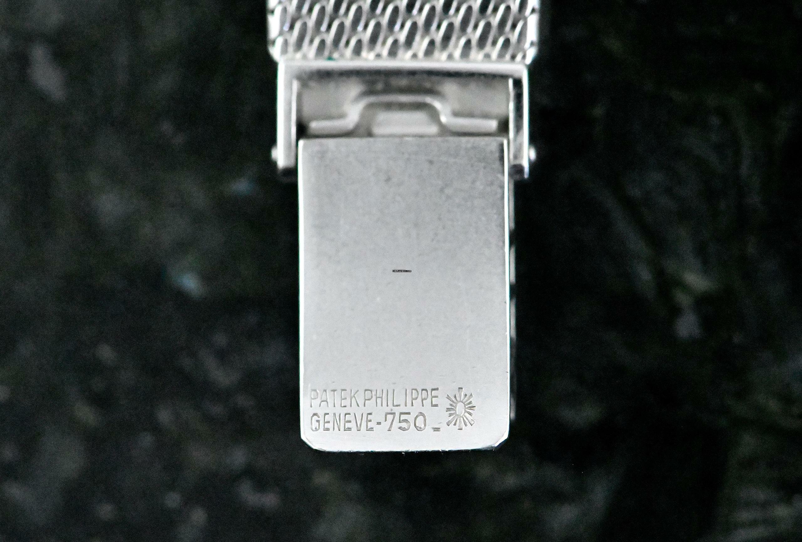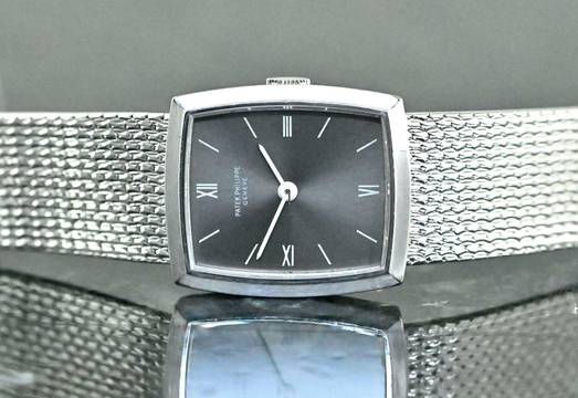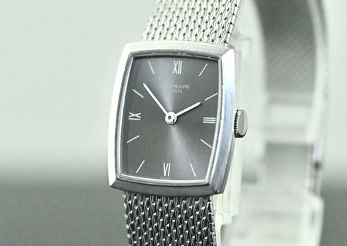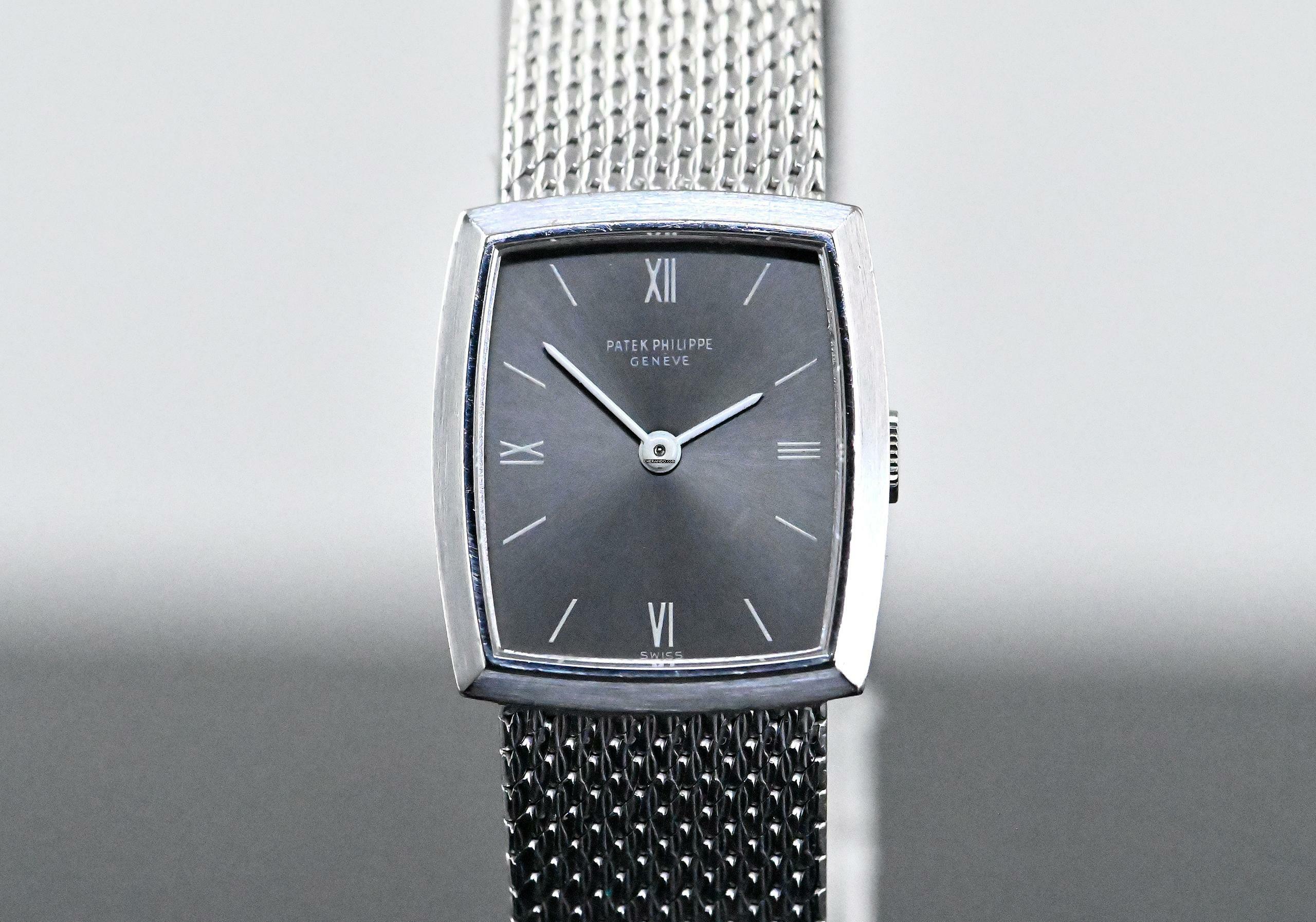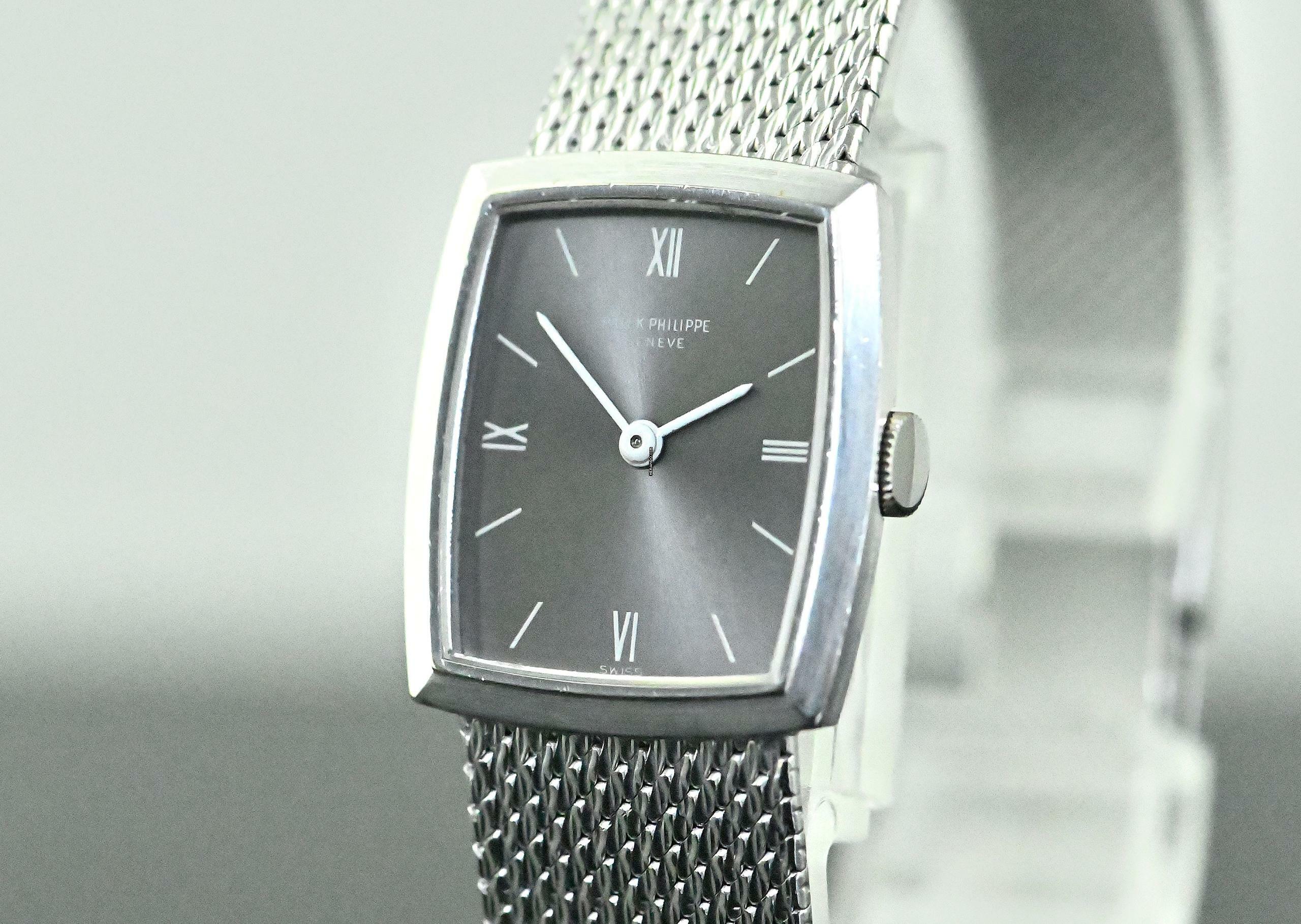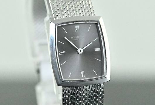 Rare vintage Patek Philippe Lady Dress Watch | reference 3354 | in 18k white gold | Patek Philippe hand-wound calibre 13.5-320 | original Patek gold bracelet with a white gold jewellery clasp | total length of approx. 17 cm including the case also suitable for a smaller wrist due to the ladder in the clasp | good condition | serviced by our master watchmaker in November 2025 – without refurbishment of the case or bracelet | highlight of the watch is the so-called ‘Greyhound’ grey dial, which looks stunning in combination with white gold | total weight of the watch is approx. 50.5 grams | dimensions of the case are 20 x 23 mm, the perfect size for a classic ladies' dress watch.
