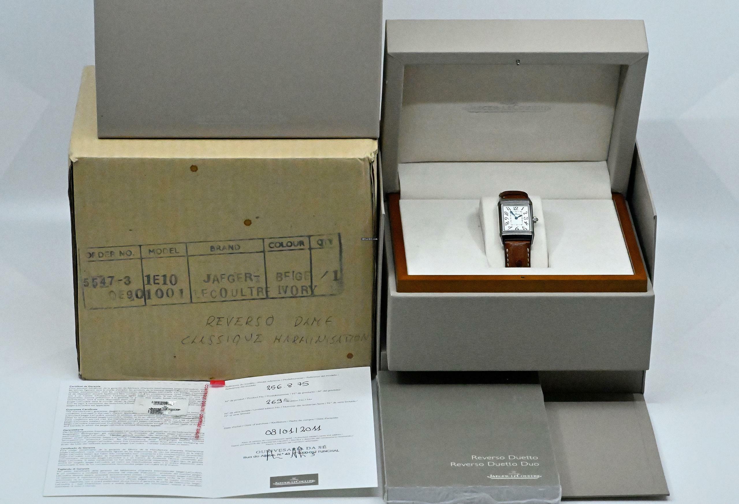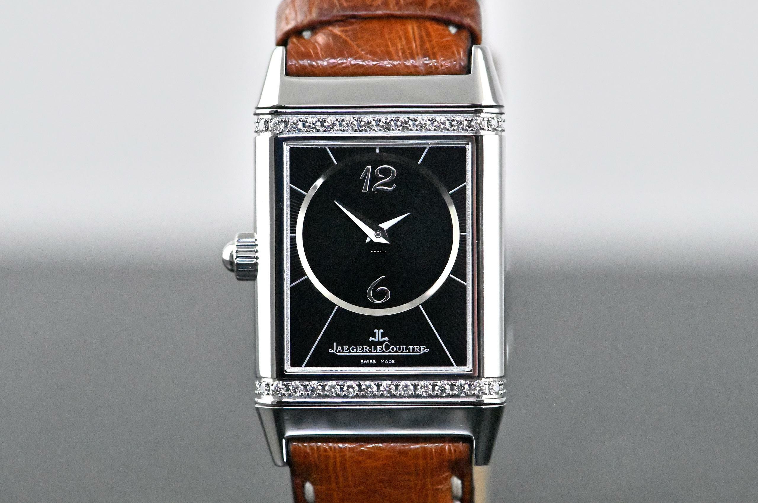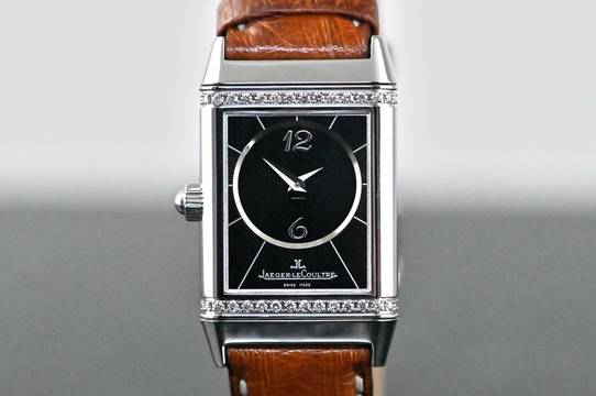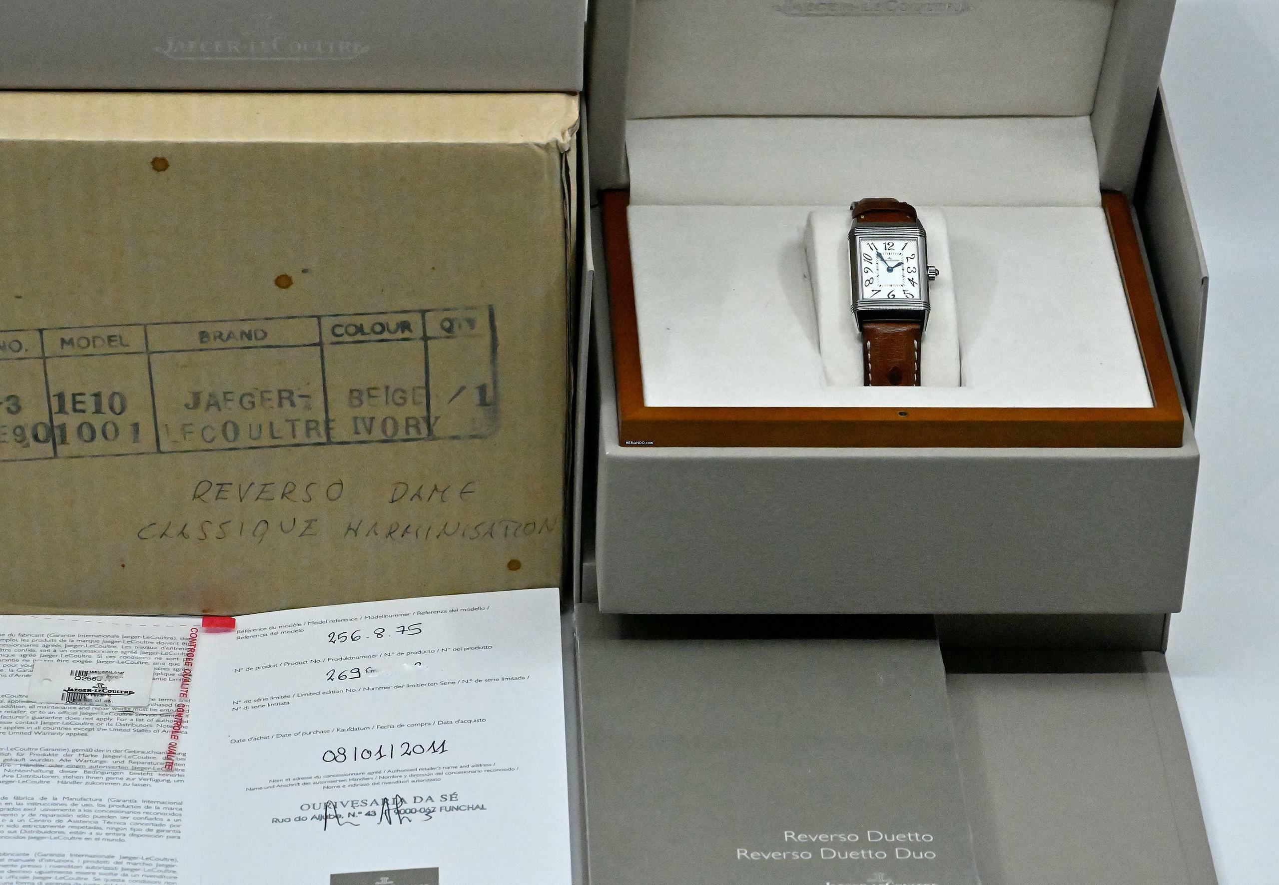 Jaeger-LeCoultre Reverso Duetto Duo ‘Diamond’ | reference 256.8.75 - Q2568402 | in steel | one side of the 180° reversible Reverso case is set with original JLC diamonds | JLC leather strap with original JLC double folding clasp in steel | good condition | dimensions of the case 24 x 40 mm | in November 2025 our master watchmaker performed a service | delivered in a full set with triple packaging: original JLC box with outer carton and cardboard carton – warranty certificate (sold in January 2011) – Reverso description/booklet – sticker.