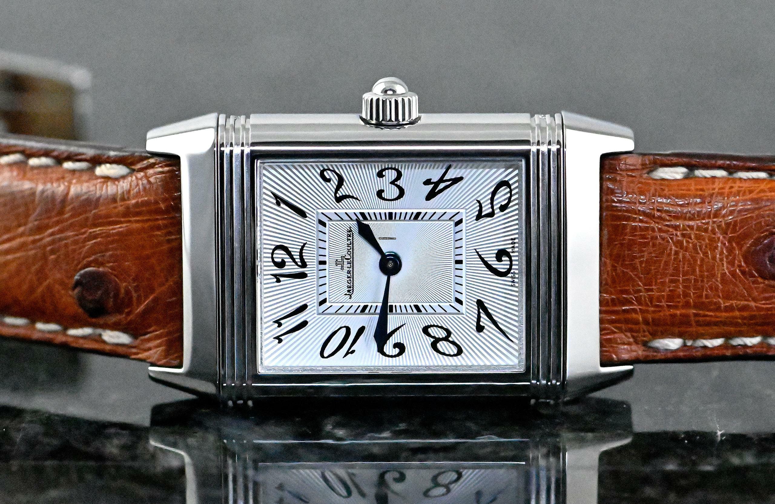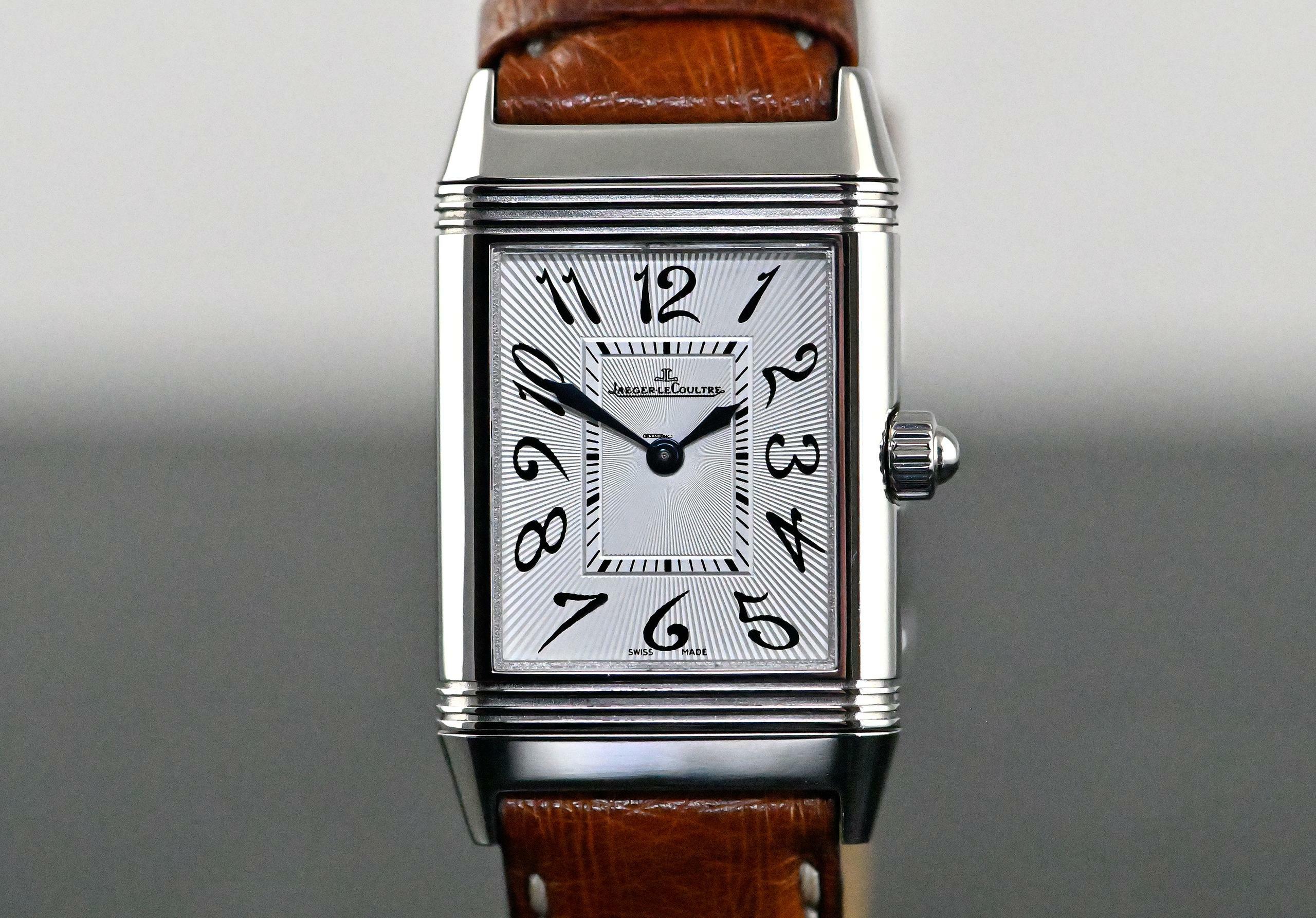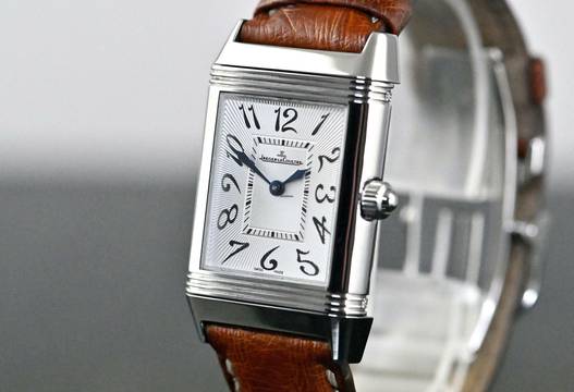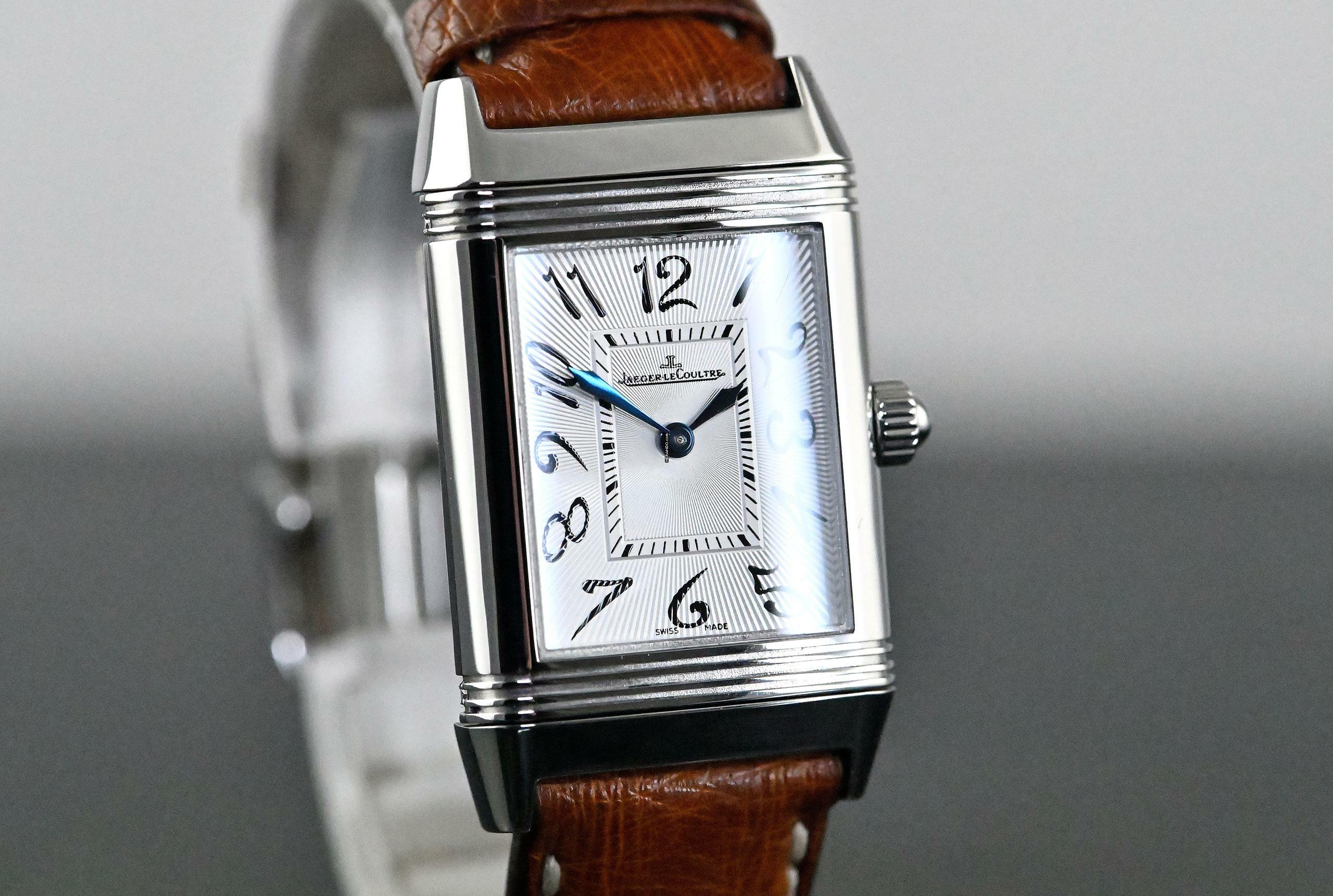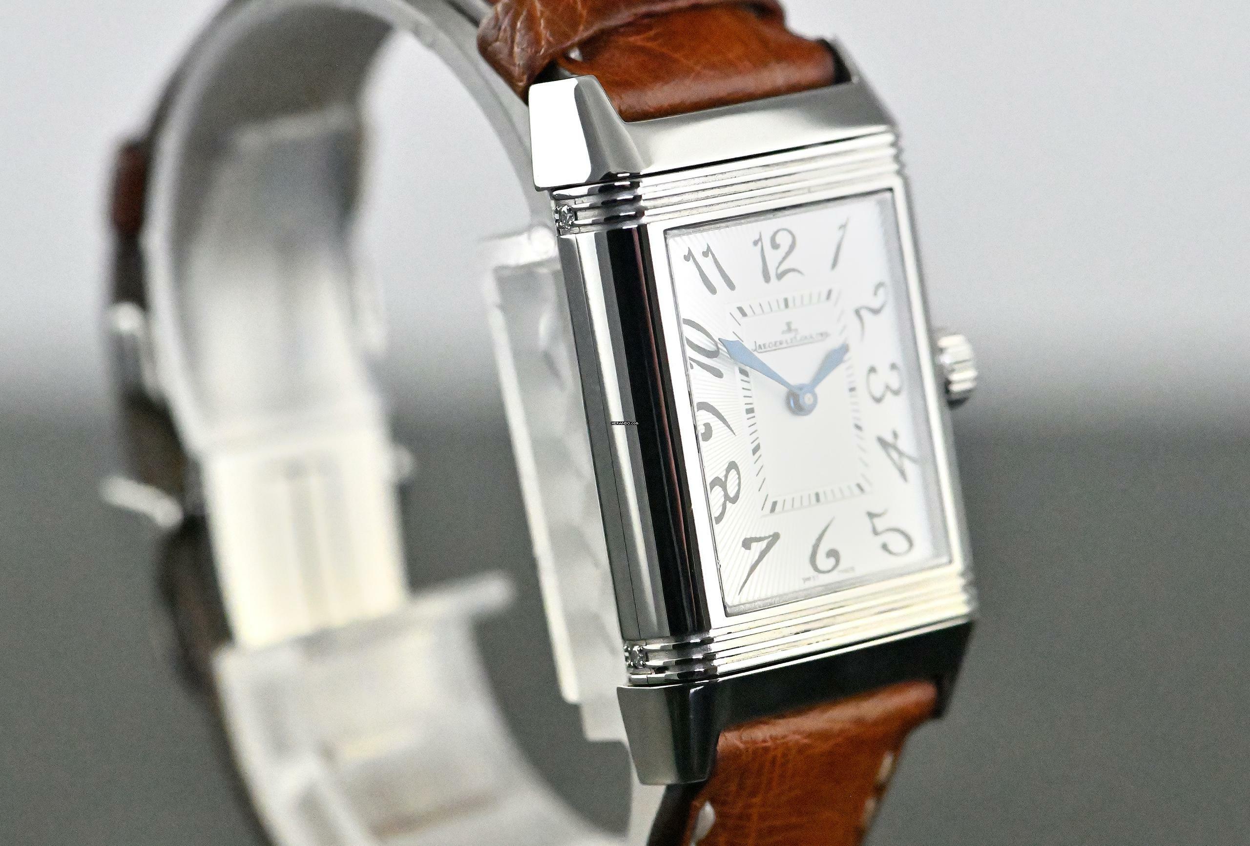 Jaeger-LeCoultre Reverso Duetto Duo ‘Diamond’ | reference 256.8.75 - Q2568402 | in steel | one side of the 180° reversible Reverso case is set with original JLC diamonds | JLC leather strap with original JLC double folding clasp in steel | good condition | dimensions of the case 24 x 40 mm | in November 2025 our master watchmaker performed a service | delivered in a full set with triple packaging: original JLC box with outer carton and cardboard carton – warranty certificate (sold in January 2011) – Reverso description/booklet – sticker.