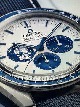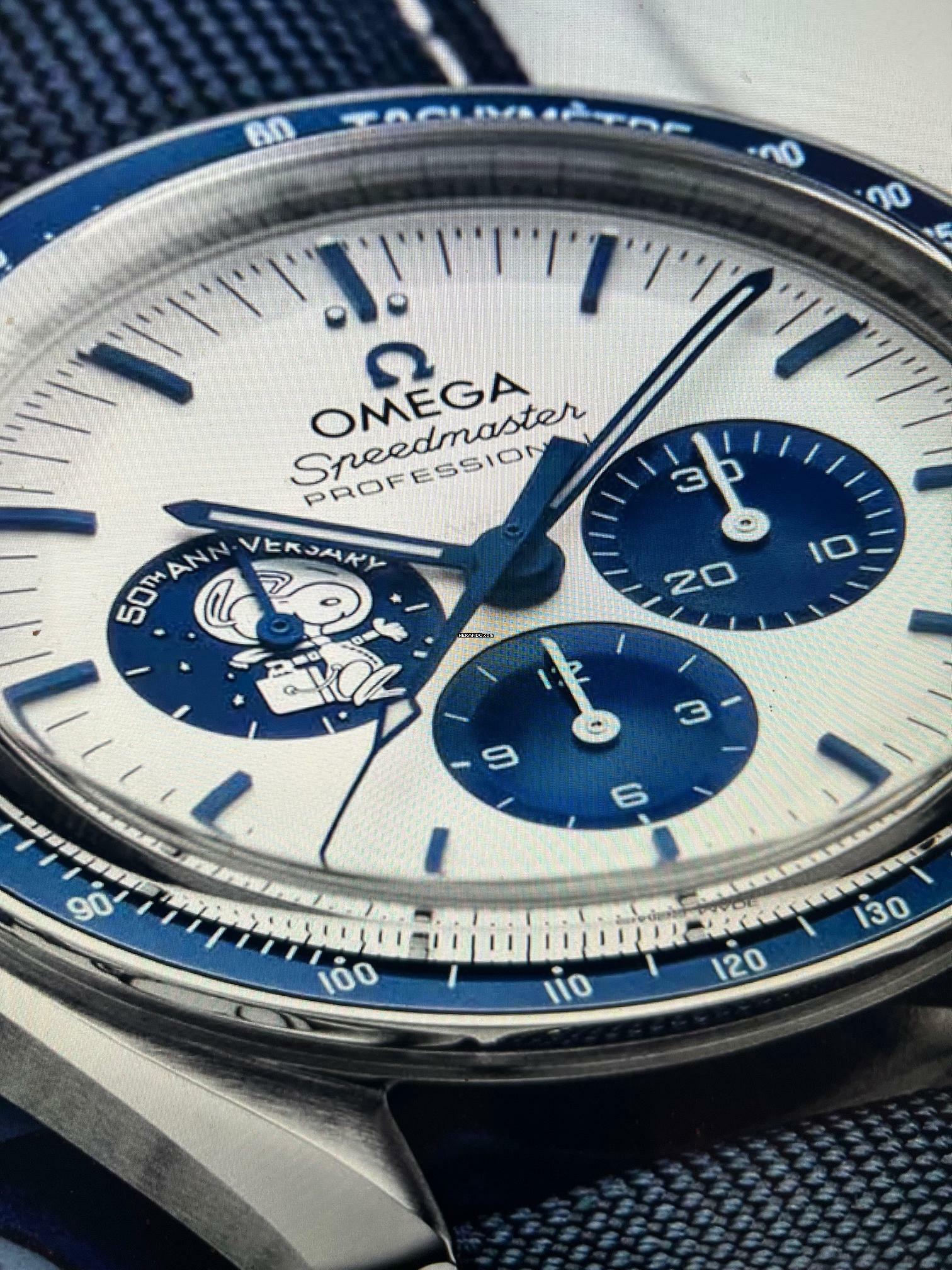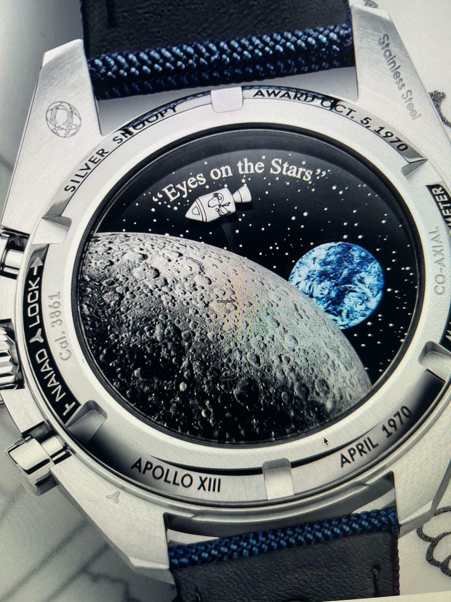 "Diese Uhr zum 50. Jubiläum erinnert an den „Silver Snoopy Award“, den OMEGA 1970 von Astronauten der NASA als Anerkennung des Engagements der Marke in der Weltraumforschung und auch während der Apollo 13 Mission erhielt.
