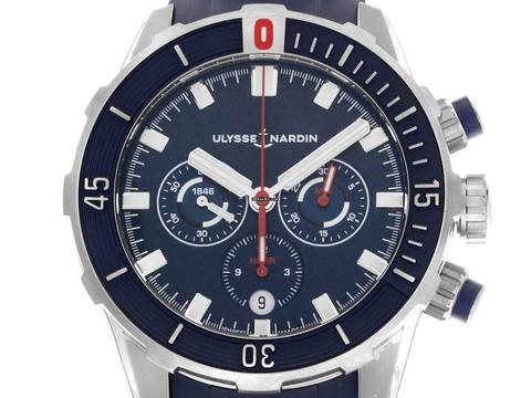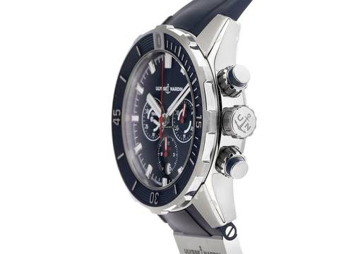 Ulysse Nardin Diver Stahl Automatik Chronograph Armband Kautschuk Gehäuse Titan poliert und satiniert, Gehäusedurchmesser ohne Krone 44mm, Gehäusehöhe 16,2mm. Lünette Titan poliert und satiniert mit blauem Inlay, 60-Minuten Skala, einseitig drehbar. Armband Kautschuk dunkelblau mit einem Titanelement, Anstoßbreite 22mm, Stiftschließe Titan mit Hersteller-Logo. Zifferblatt blau mit aufgesetzten Edelstahl Leuchtindexen und Edelstahl Leuchtzeigern. Uhrwerk Automatik, Ulysse Nardin Manufakturkaliber UN-150 mit 25 Edelsteinen, Gangreserve ca. 48 Stunden, Silizium Hemmung. Anzeige von Stunde und Minute über Zeiger aus der Mitte, kleine Sekunde mit Sekundenstopp zur sekundengenauen Einstellung der Uhrzeit bei 9 Uhr, Datumsanzeige mit Schnellverstellung unter Glaslupe bei 6 Uhr. Saphirglas kratzfest. Krone Titan verschraubbar mit Hersteller-Logo, Chronographendrücker verschraubbar. Boden Titan 6-fach verschraubt und graviert mit Saphirglas Sichtfenster. Gewicht der Uhr inklusive Armband 107g. Wasserdicht bis 30 ATM. Referenznummer: 1503-170-3/93, ID: ST1160181901125H-13770, Artikelnummer: 10000083249. Original Ulysse Nardin Box mit Umkarton und Garantie Papiere von Oktober 2025 sowie Beschreibung, Full Set. Ungetragen. Lieferzeit sofort. Inklusive Uhrenpass mit einem Farbbild, der genauen Beschreibung sowie dem Wiederbeschaffungswert der Uhr über 13770,-€ und 1000 Tage Garantie ab Kaufdatum.