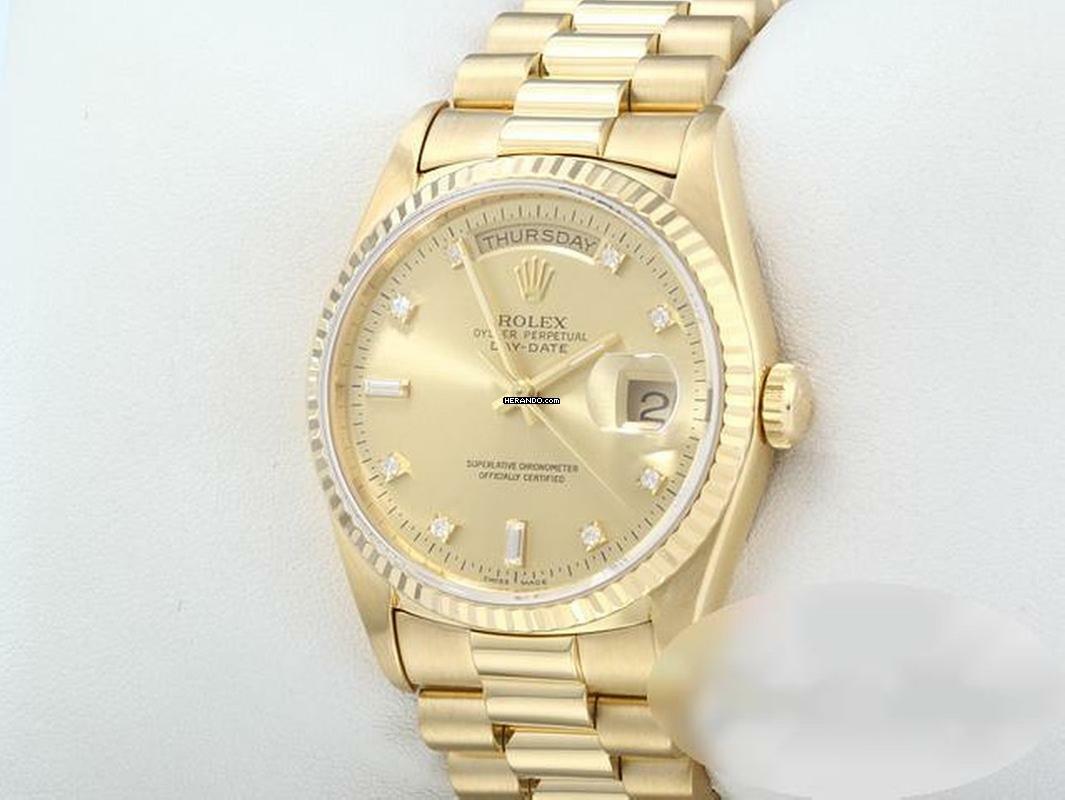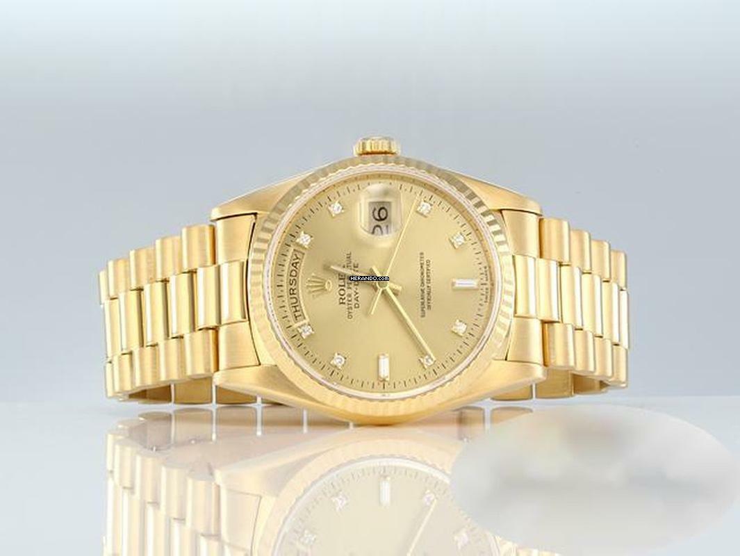 Diese einmalig-schöne und sehr exklusive Rolex ist aus feinstem Gelbgold 750 gefertigtFantastisches und seltenes champagnerfarbenes Zifferblatt mit 10 strahlenden Diamanten besetzt, original von Rolex