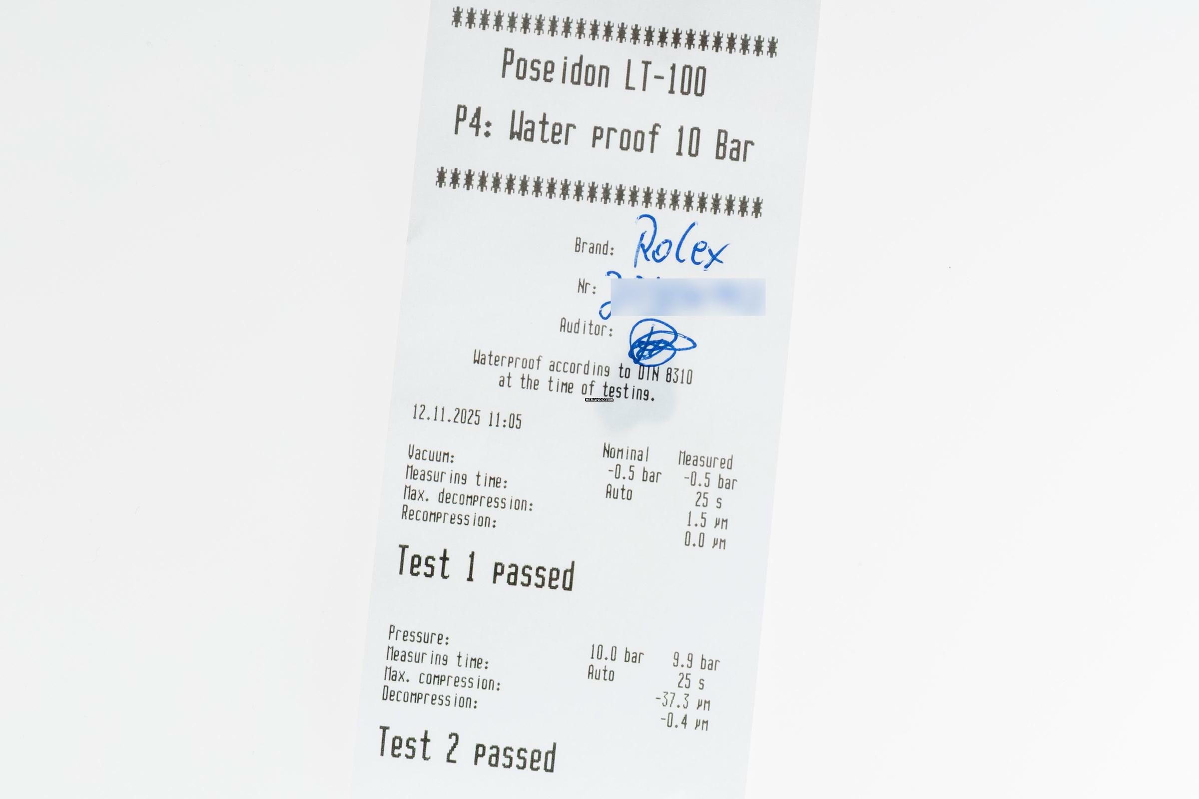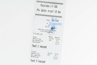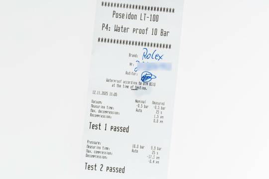 * Wenn die Uhr positiv auf Wasserdichtigkeit getestet wurde, dann gilt diese Eigenschaft zum Zeitpunkt der Messung. Wasserdichtigkeit ist nach DIN 8310 keine bleibende Eigenschaft. Sie sollte jährlich und vor besonderen Belastungen überprüft werden, da die eingebauten Dichtelemente in ihrer Funktion und im täglichen Gebrauch nachlassen. Einflüsse wie starke Temperaturschwankungen, Chlor, Seife oder Salzwasser wirken sich negativ auf die Wasserdichtigkeit aus.