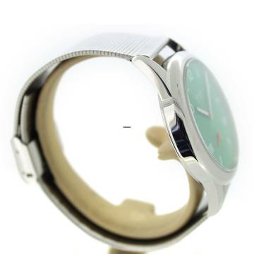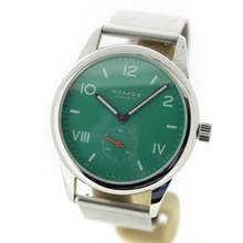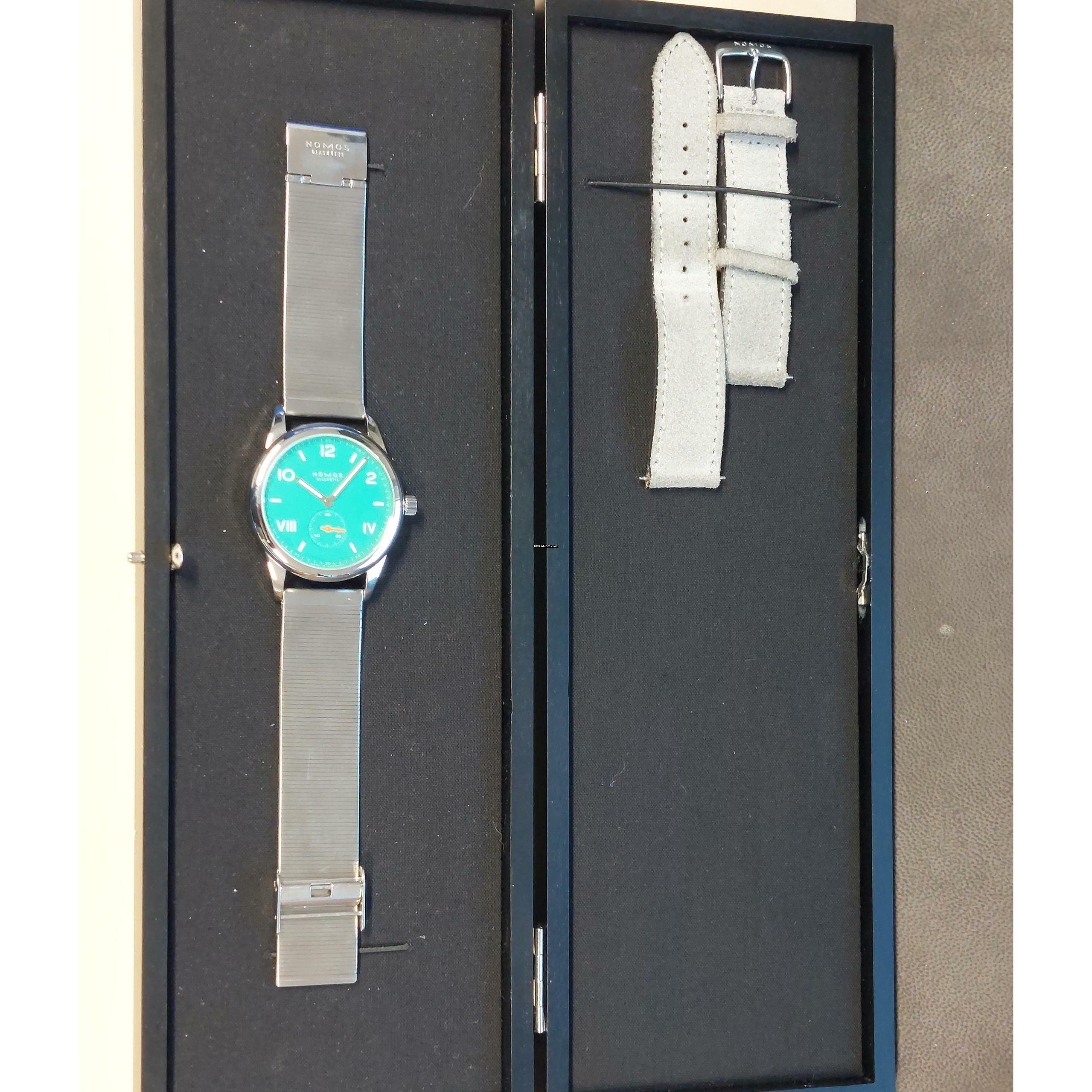 This Nomos watch features a 36 mm steel case. The watch features a green dial. The watch is equipped with a steel strap.