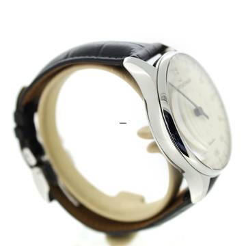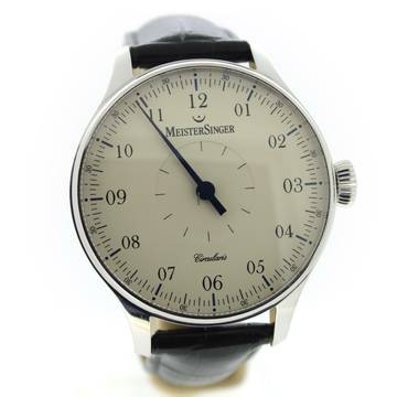 This MeisterSinger watch features a 43mm steel case. The watch features a Créme dial. The watch is equipped with a black leather strap.