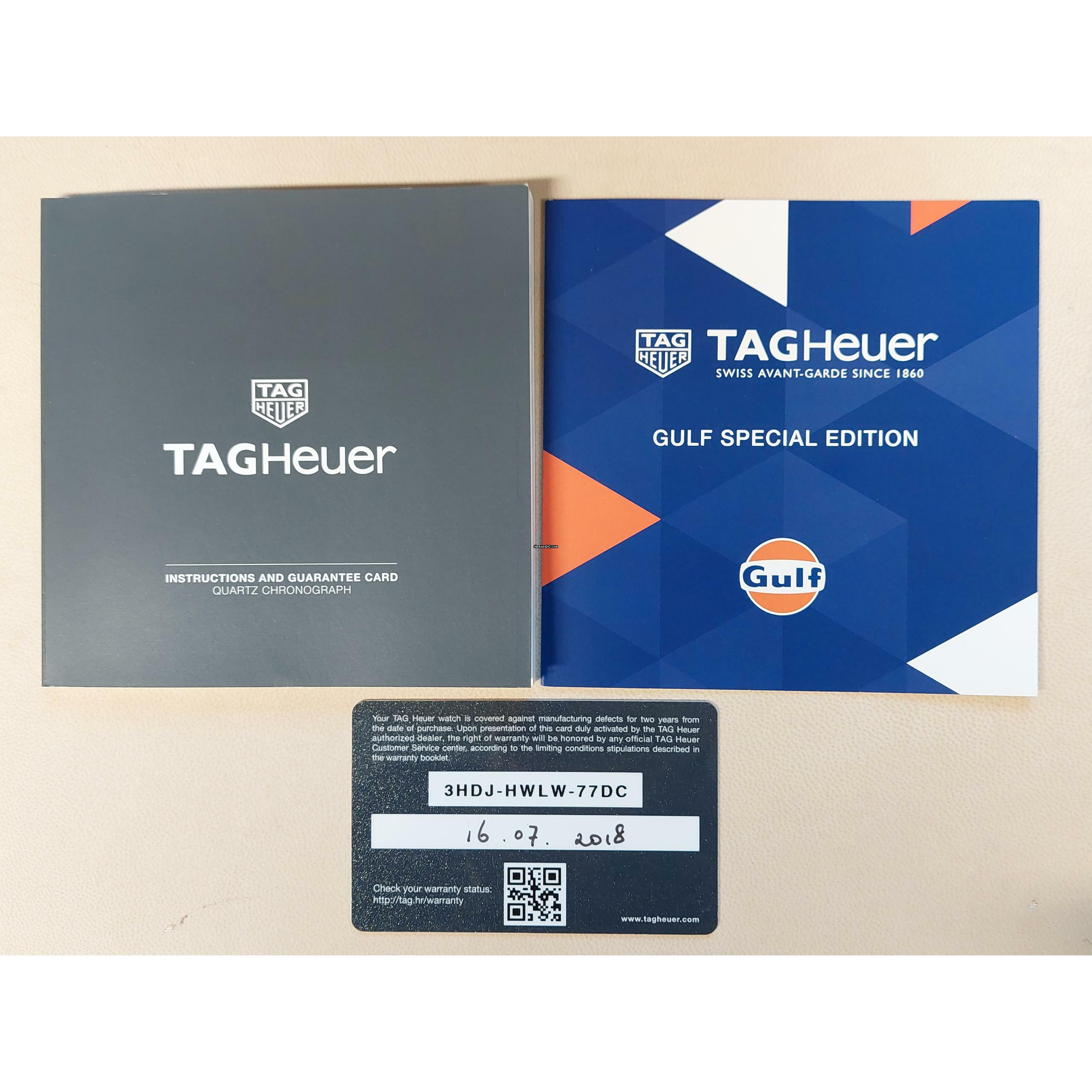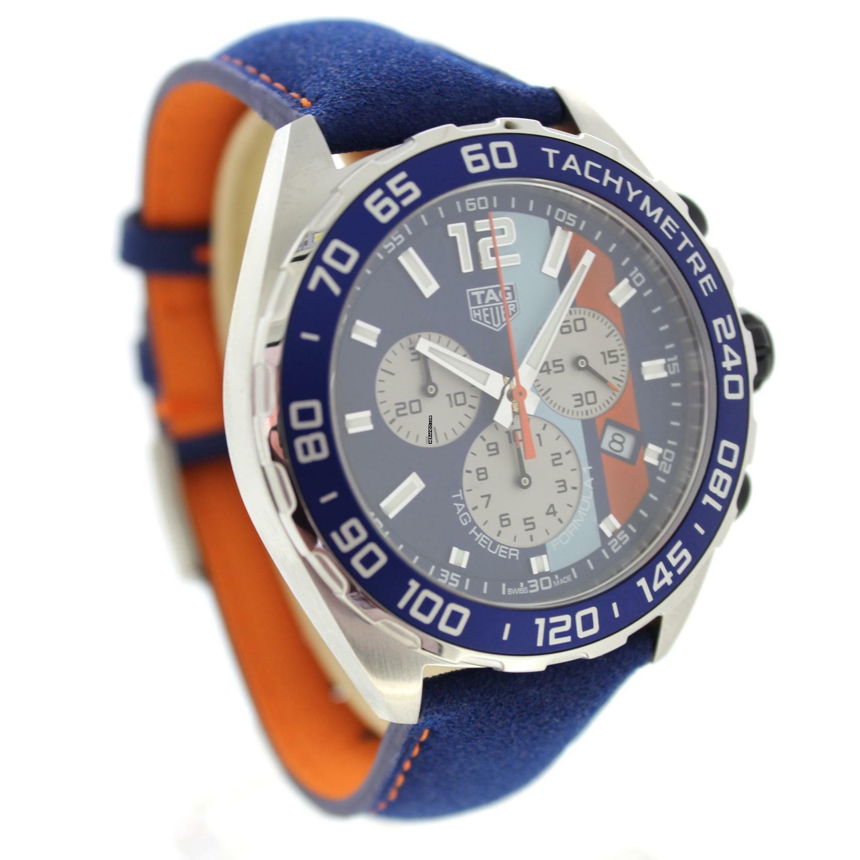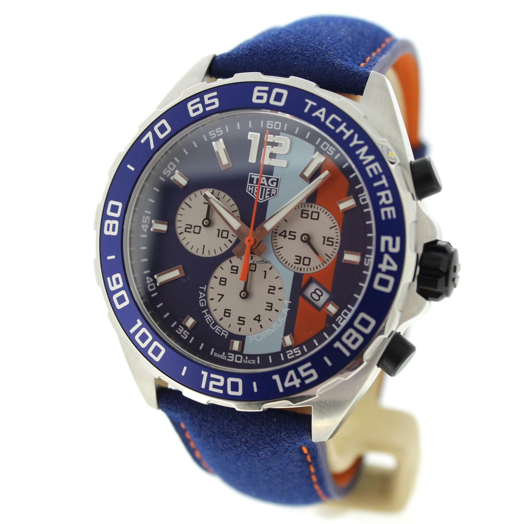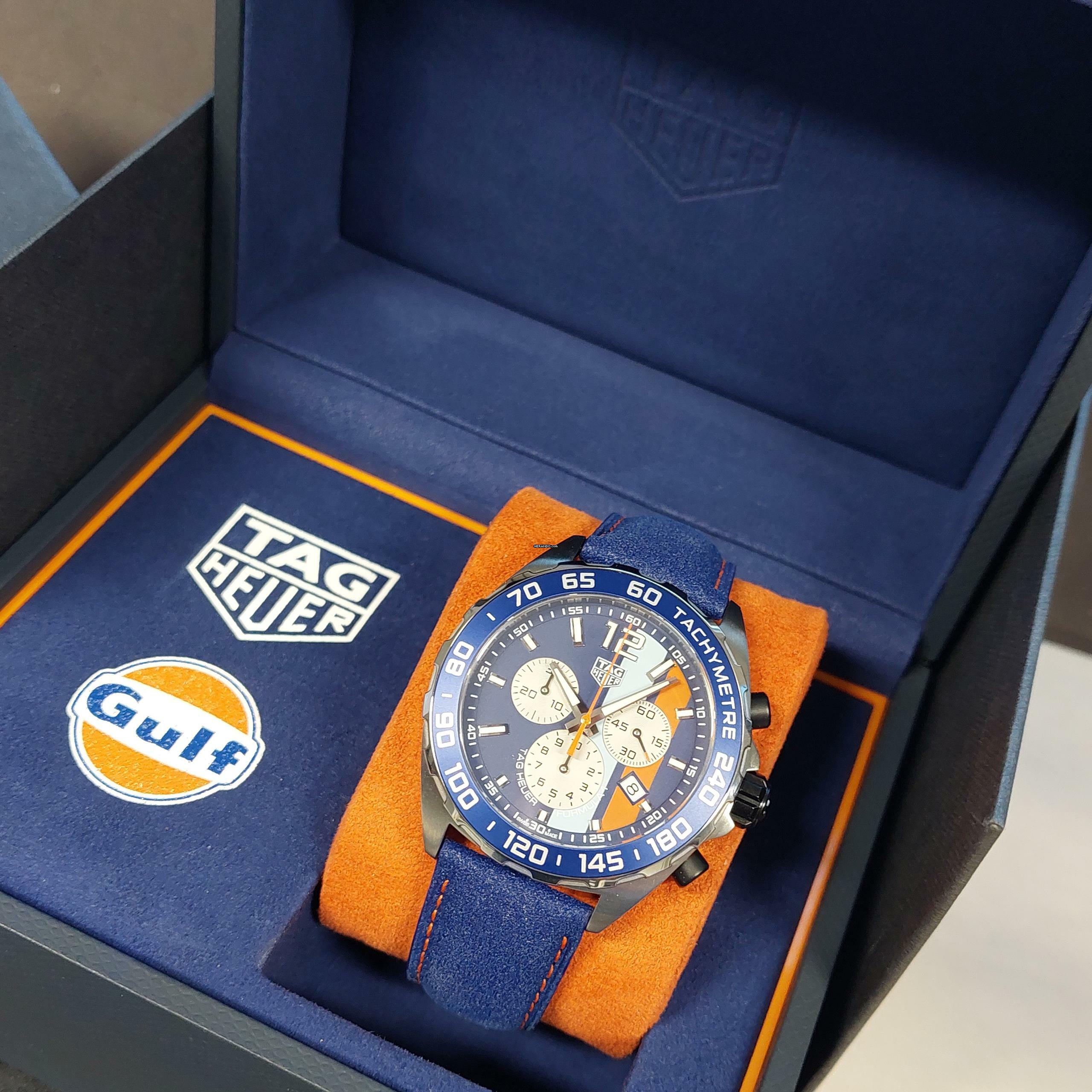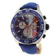 This Tag Heuer watch features a 43mm steel case. The watch features a blue with orange dial. The watch is equipped with a leather strap.