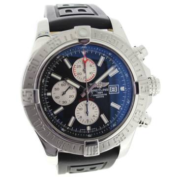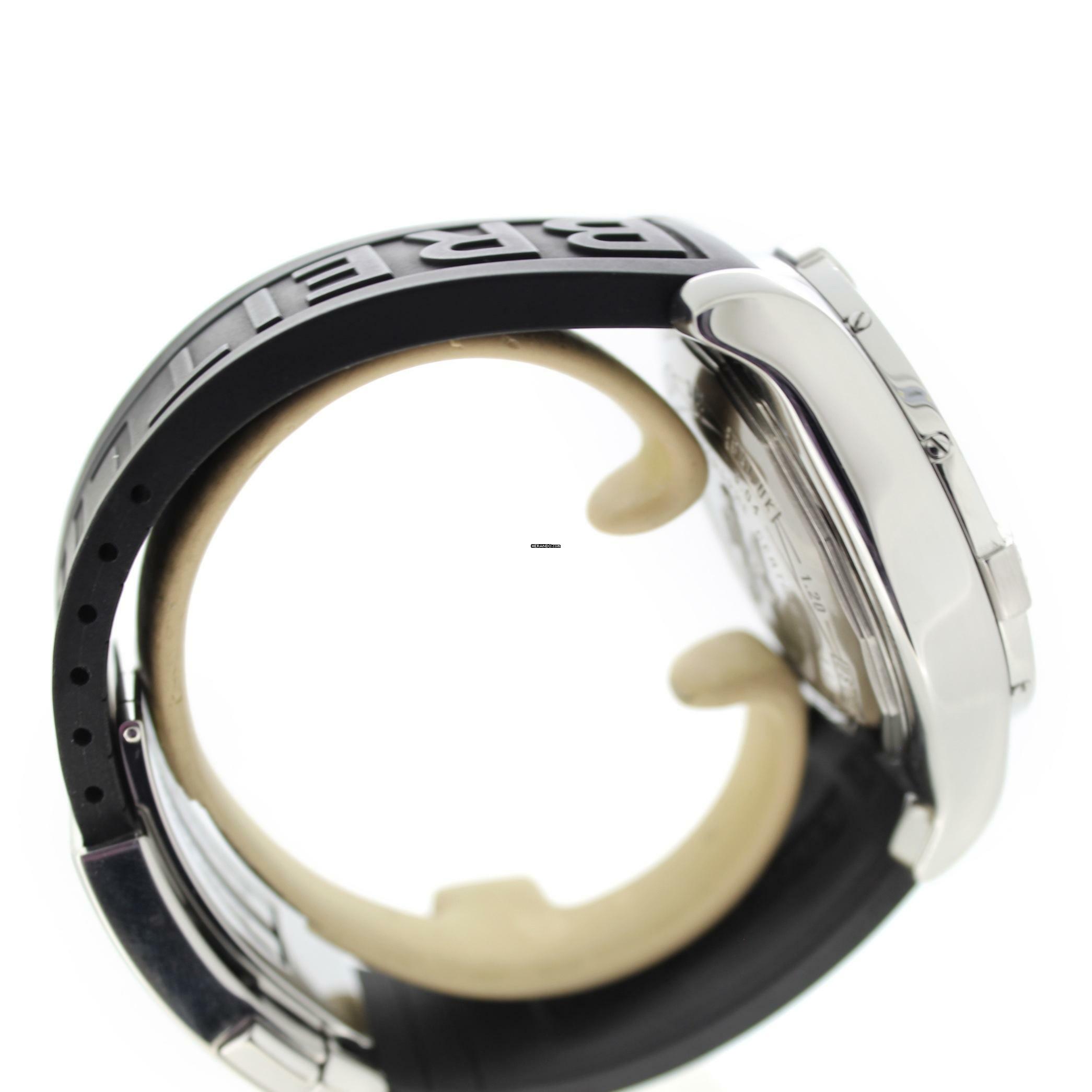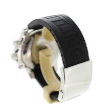 This Breitling watch features a 48mm steel case. The watch features a black dial. The watch is equipped with a black rubber strap.
