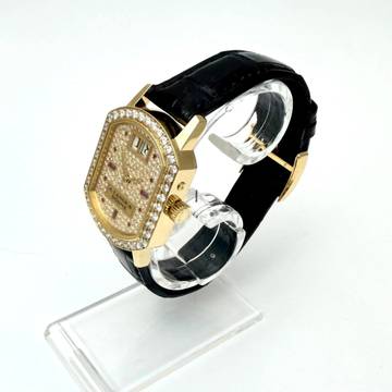 verschraubter und gravierter Gelbgold-Saphirglasboden,