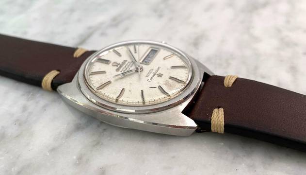 Seltene Omega mit "Meister" Ziffernblatt. Meister war ein Juwelier an dem Omega direkt ausgeliefert hat. Als Dank für die Zusammenarbeit hat Omega einige Modelle, eine kurze Zeit lang, mit dem Juweliernamen am Ziffernblatt produziert. Auf den Macro-Fotos sieht man auch, dass das Ziffernblatt zusätzlicheine wunderschöne Iced-Out-Leinen-Struktur hat. Die Day/Date Anzeige ist ein zusätzliches Plus. Persönlich finde ich, dass diese Day Date Anzeigen am besten zu den C-förmigen Gehäuse Constellation Modellen passen.