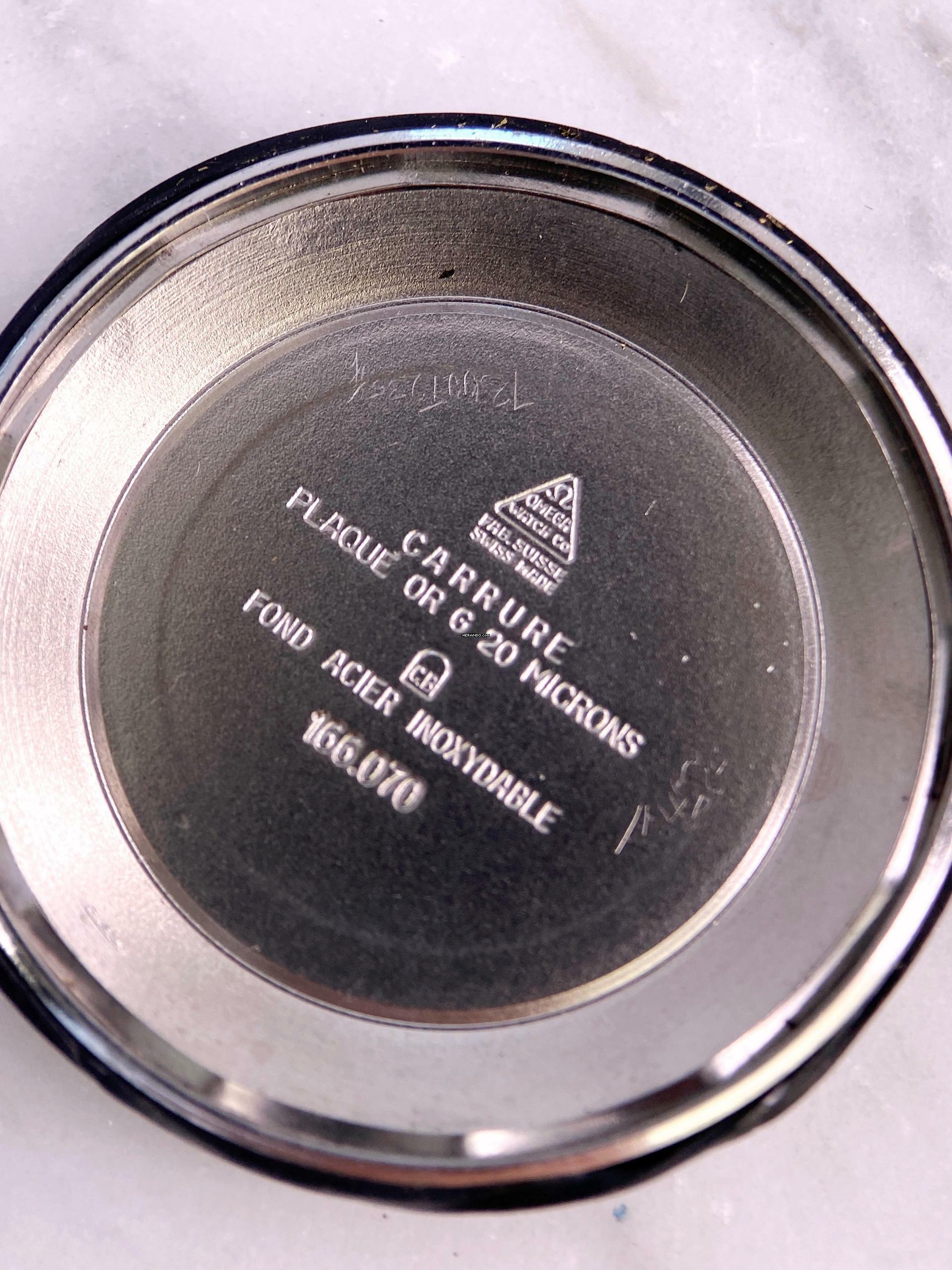 Innen: Die Uhr FUNKTIONIERT GUT und HÄLT DIE ZEIT. EIN JAHR GARANTIE. Wir haben sie nicht serviciert, weil sie noch gut genug läuft. (Bitte kontaktiere uns, wenn du ein neues Service dazu buchen möchtest, für 3 Jahre Garantie.)
