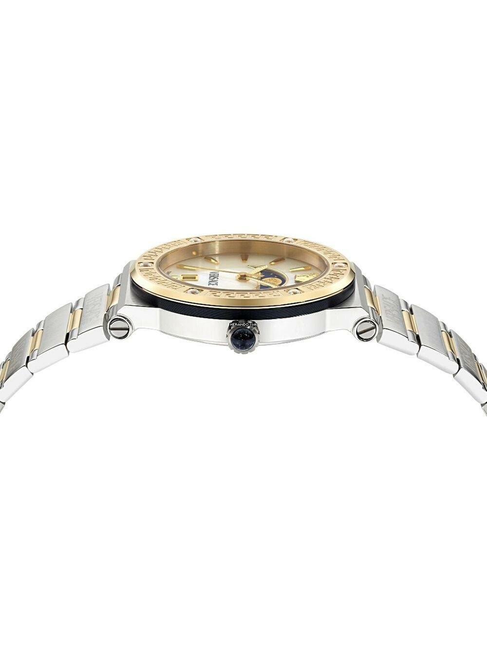 Das Herzstück dieses Zeitmessers ist ein Quarz Uhrwerk (mit Batterie), das, wie für Versace Uhren üblich, eine präzise Zeitmessung garantiert und folgende Funktionen bereitstellt: Stunde, Minute, Sekunde, Datum, Mondphase.