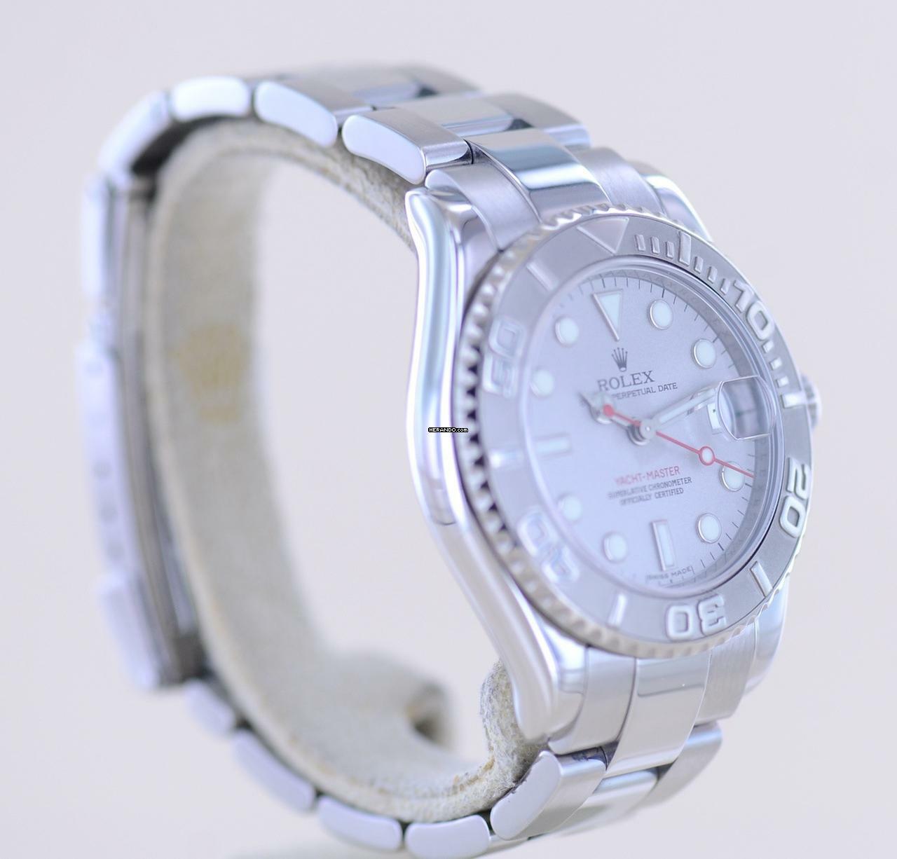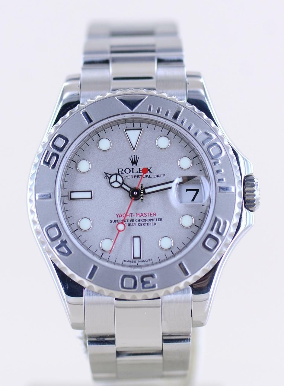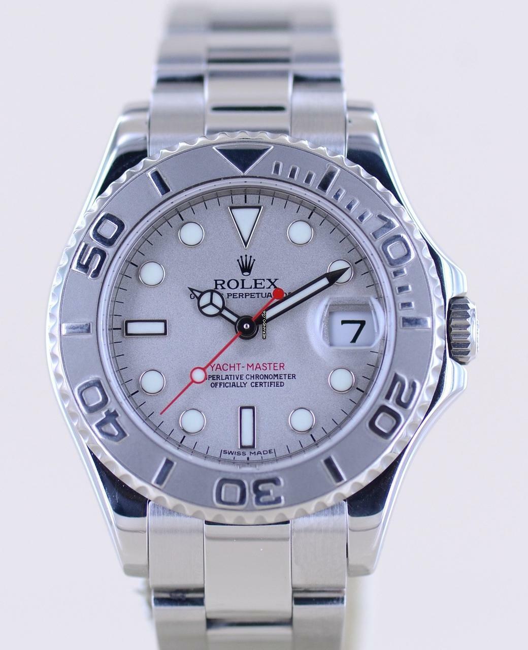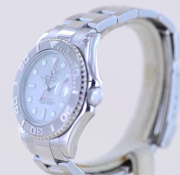 Schöne Rolex Yachtmaster Medium in Stahl Platin von 2010 mit der Referenz 168622. Die aus der G-Serie stammende Uhr hat das Super-Luminova-Zifferblatt sowie das massive Oysterband mit massiven Gehäuseantößen. Einfach ein wunderbarer Klassiker mit großem Wertsteigerungspotenzial. Die Yachtmaster gehört in jede gute Uhrensammlung, macht jedoch auch im Alltag eine super Figur und hält bei entsprechender Pflege ein Leben lang. Das klare Zifferblatt ist fernab von jedem Trend zeitlos schön und wird es auch immer bleiben. Es ist genau wie die Lünette aus massivem Platin und im Look absolut unverwechselbar.Ein schöner Nebeneffekt der Yachtmaster ist das Understatement. Das massive Band - wie bei der Daytona - und das eigene abgerundete Gehäuse mit dem hellen Platin passen nicht direkt in die landläufigen Rolexformen. Einfach genial luxuriös.