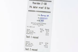 * Wenn die Uhr positiv auf Wasserdichtigkeit getestet wurde, dann gilt diese Eigenschaft zum Zeitpunkt der Messung. Wasserdichtigkeit ist nach DIN 8310 keine bleibende Eigenschaft. Sie sollte jährlich und vor besonderen Belastungen überprüft werden, da die eingebauten Dichtelemente in ihrer Funktion und im täglichen Gebrauch nachlassen. Einflüsse wie starke Temperaturschwankungen, Chlor, Seife oder Salzwasser wirken sich negativ auf die Wasserdichtigkeit aus.