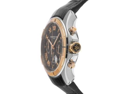 Raymond Weil Parsifal Stahl Roségold Automatik Chronograph Armband Leder Faltschließe Gehäuse Edelstahl poliert und satiniert, Gehäusedurchmesser ohne Krone 40mm, Gehäusehöhe 12,2mm. Lünette Roségold poliert. Armband Leder schwarz mit Ziernaht, Anstoßbreite 21mm, Sicherheitsfaltschließe Edelstahl mit Hersteller-Logo. Zifferblatt schwarz mit roségoldenen römischen Ziffern und roségoldenen Zeigern. Uhrwerk Automatik, Chronograph, Kaliber RW7311 mit 61 Edelsteinen. Anzeige von Stunde und Minute über Zeiger aus der Mitte, kleine Sekunde mit Sekundenstopp zur sekundengenauen Einstellung der Uhrzeit bei 3 Uhr, Datumsanzeige mit Schnellverstellung unter Glaslupe zwischen 4 und 5 Uhr. Saphirglas kratzfest. Krone mit Hersteller-Logo. Boden Edelstahl 4-fach verschraubt und graviert mit Saphirglas Sichtfenster. Gewicht der Uhr inklusive Armband 108g. Referenznummer: 7260-SC5-00208, Gehäusenummer: V215XXX, ID: P193516001125H-3800, Artikelnummer: 10000083296. Mit Gangkontrolle und kompletter äußerlicher Aufarbeitung von November 2025. Original Raymond Weil Box mit Umkarton und Garantie Papiere von Juni 2012 sowie Watchregister Auszug von November 2025, The Watch Register Zertifikat / ohne Eintrag (Internationale Datenbank für verlorene oder gestohlene Uhren), Full Set. Kapitalanlage mit Wertsteigerungspotential, extrem seltenes Sammlerstück, aus erster Hand. Wie Neu. Lieferzeit sofort. Inklusive certified pre owned Siegel / Uhrenpass mit einem Farbbild, der genauen Beschreibung sowie dem Wiederbeschaffungswert der Uhr über 3800,-€ und 1000 Tage Garantie ab Kaufdatum.