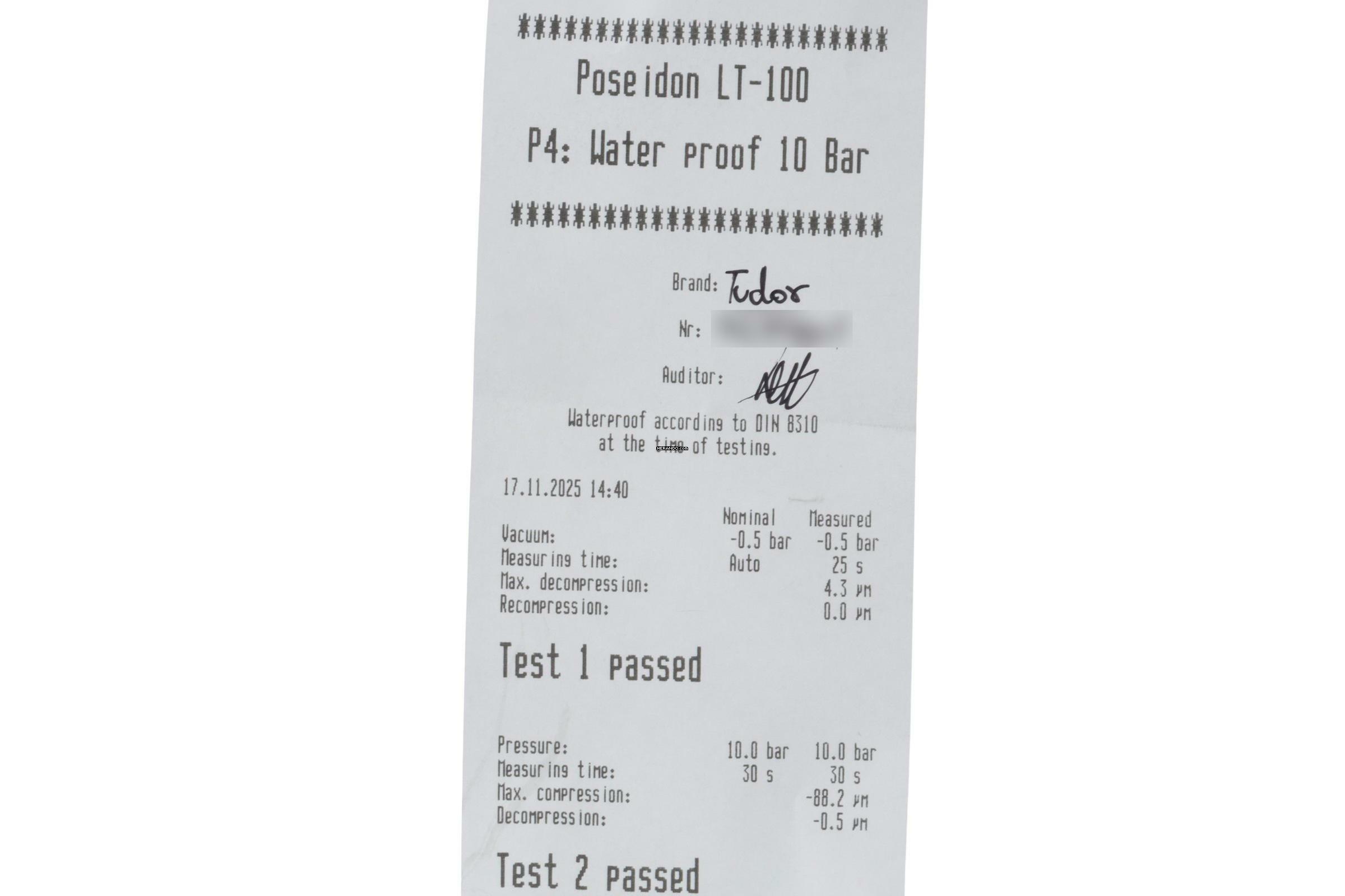 * Wenn die Uhr positiv auf Wasserdichtigkeit getestet wurde, dann gilt diese Eigenschaft zum Zeitpunkt der Messung. Wasserdichtigkeit ist nach DIN 8310 keine bleibende Eigenschaft. Sie sollte jährlich und vor besonderen Belastungen überprüft werden, da die eingebauten Dichtelemente in ihrer Funktion und im täglichen Gebrauch nachlassen. Einflüsse wie starke Temperaturschwankungen, Chlor, Seife oder Salzwasser wirken sich negativ auf die Wasserdichtigkeit aus.
