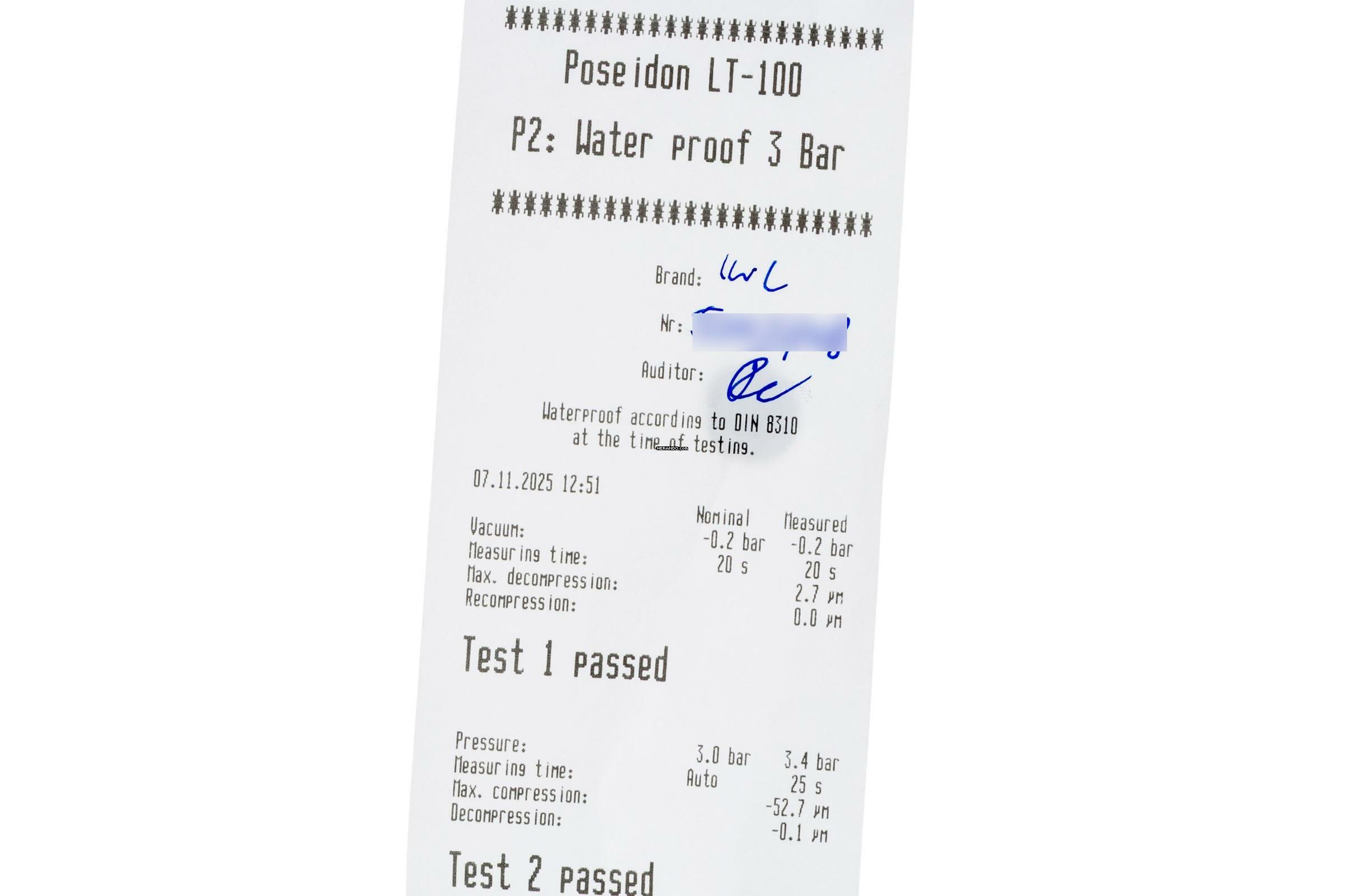 * Wenn die Uhr positiv auf Wasserdichtigkeit getestet wurde, dann gilt diese Eigenschaft zum Zeitpunkt der Messung. Wasserdichtigkeit ist nach DIN 8310 keine bleibende Eigenschaft. Sie sollte jährlich und vor besonderen Belastungen überprüft werden, da die eingebauten Dichtelemente in ihrer Funktion und im täglichen Gebrauch nachlassen. Einflüsse wie starke Temperaturschwankungen, Chlor, Seife oder Salzwasser wirken sich negativ auf die Wasserdichtigkeit aus.