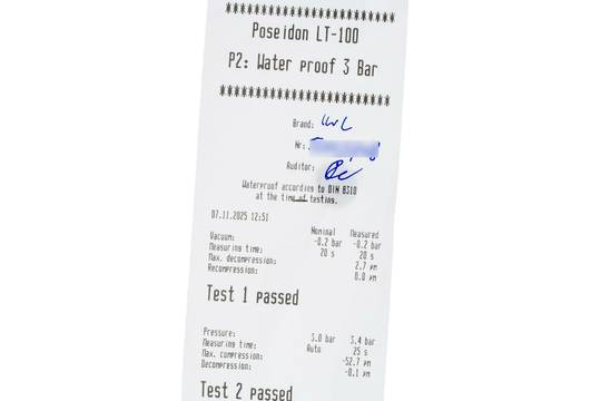 - Wasserdichtigkeit*: ja. Das Prüfprotokoll mit Prüfdruckangabe liegt bei.