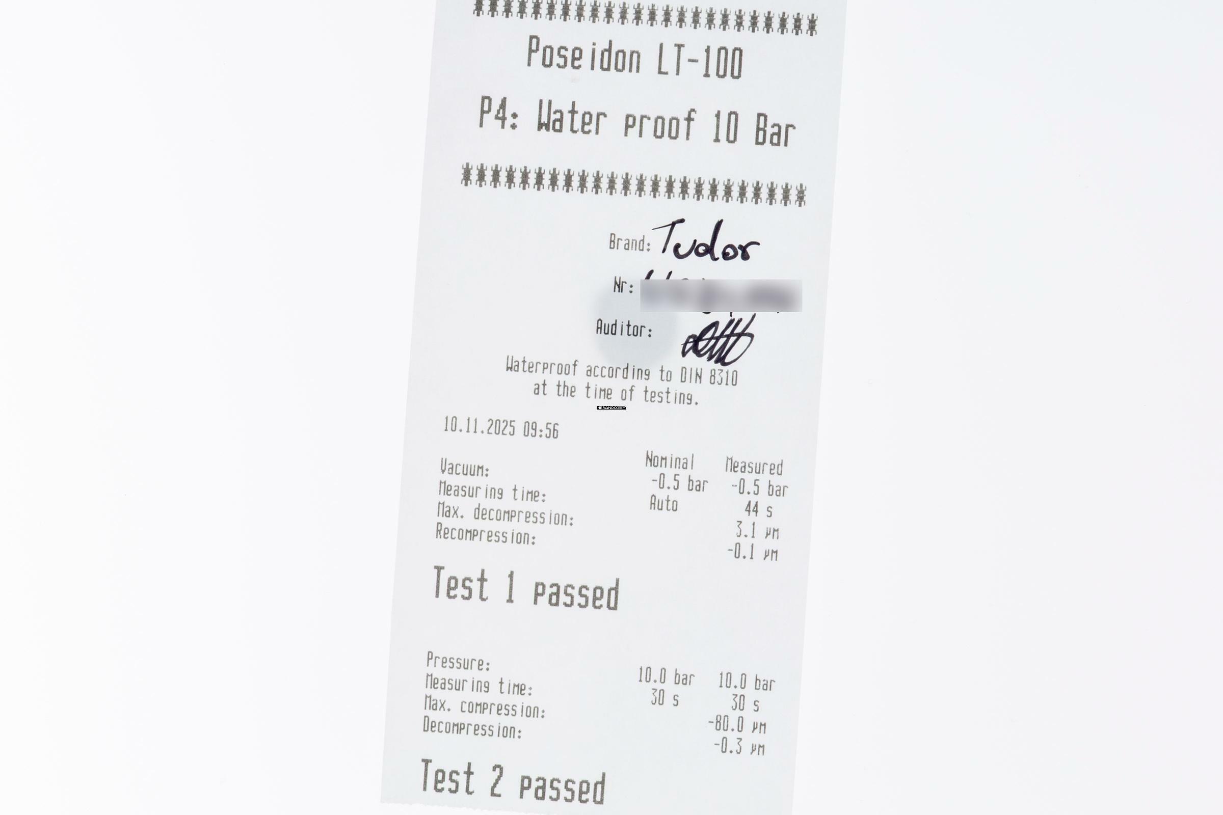 * Wenn die Uhr positiv auf Wasserdichtigkeit getestet wurde, dann gilt diese Eigenschaft zum Zeitpunkt der Messung. Wasserdichtigkeit ist nach DIN 8310 keine bleibende Eigenschaft. Sie sollte jährlich und vor besonderen Belastungen überprüft werden, da die eingebauten Dichtelemente in ihrer Funktion und im täglichen Gebrauch nachlassen. Einflüsse wie starke Temperaturschwankungen, Chlor, Seife oder Salzwasser wirken sich negativ auf die Wasserdichtigkeit aus.