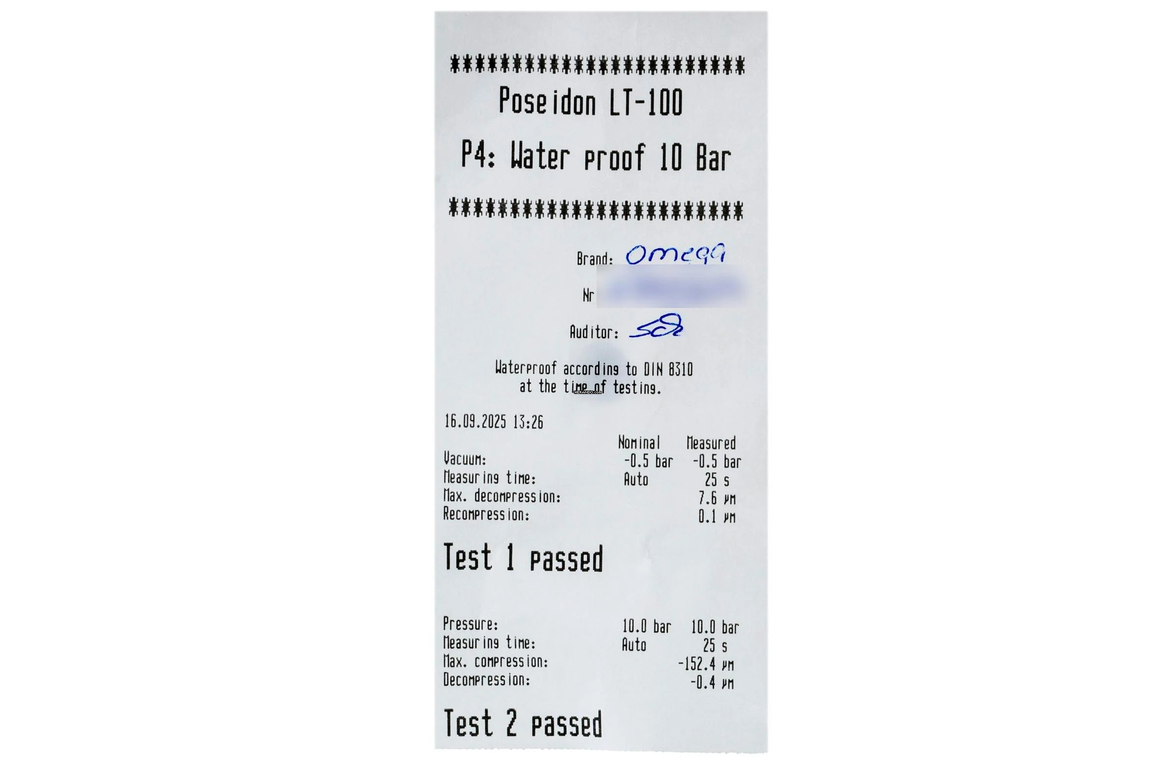 * Wenn die Uhr positiv auf Wasserdichtigkeit getestet wurde, dann gilt diese Eigenschaft zum Zeitpunkt der Messung. Wasserdichtigkeit ist nach DIN 8310 keine bleibende Eigenschaft. Sie sollte jährlich und vor besonderen Belastungen überprüft werden, da die eingebauten Dichtelemente in ihrer Funktion und im täglichen Gebrauch nachlassen. Einflüsse wie starke Temperaturschwankungen, Chlor, Seife oder Salzwasser wirken sich negativ auf die Wasserdichtigkeit aus.