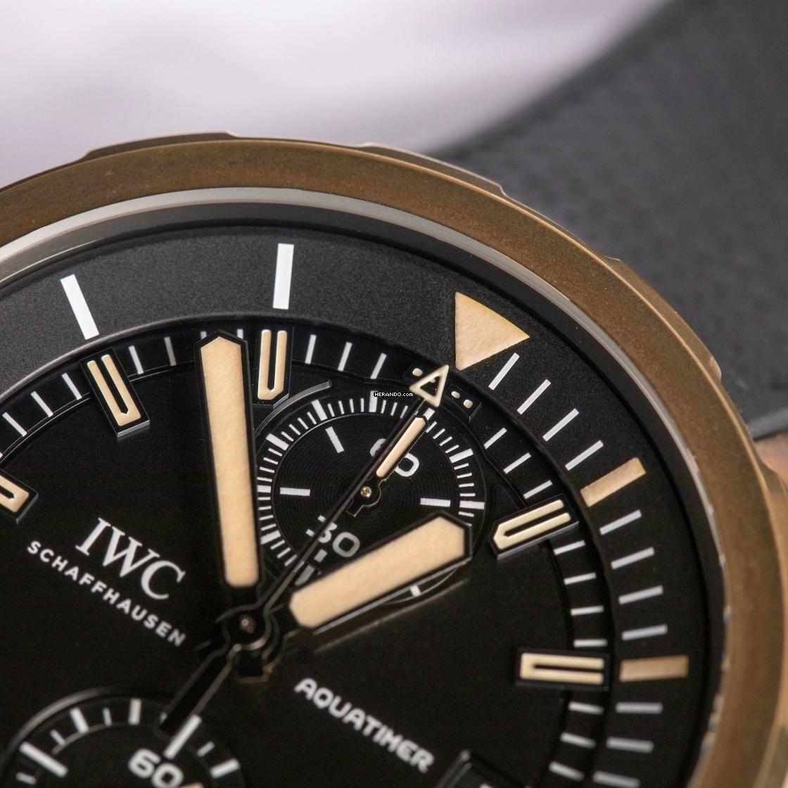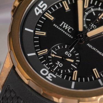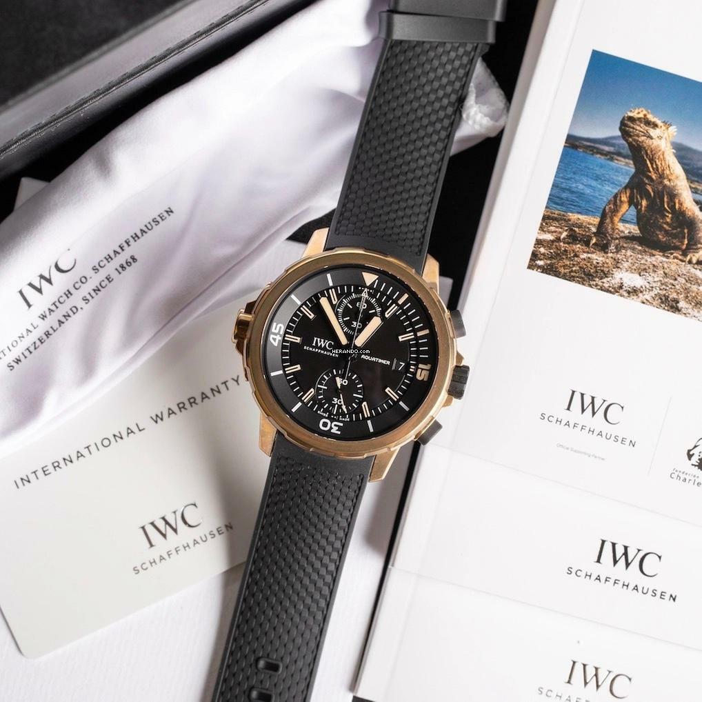 Diese robuste 44-mm-Taucheruhr (16,6 mm dick) verfügt über ein tiefgrünes Zifferblatt mit massiven Leuchtzeigern und Indizes, die von IWC patentierte SafeDive-Lünette mit Innen- und Außenring (Bedienung über die linke Krone) und eine Wasserdichtigkeit von 300 m. Der bronzefarbene Lünetteneinsatz und die Krone bilden einen schönen Kontrast zum Gehäuse, während der Sichtboden den Blick auf das hauseigene Automatikwerk Kaliber 80110 mit Pellaton-Aufzug, 44 Stunden Gangreserve, weicheisenmagnetischem Käfig und einem auf dem Rotor eingravierten Bronzemedaillon von Charles Darwin freigibt.