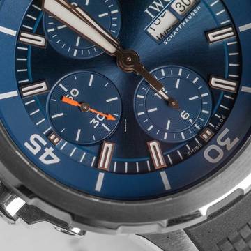 Die IWC Aquatimer Chronograph Edition „La Cumbre“ IW376805 (limitierte Auflage von 2.500 Stück aus dem Jahr 2014) ist eine kraftvolle Hommage von IWC an Jacques-Yves Cousteau und die berühmte Expedition der 1970er Jahre zur Vulkaninsel La Cumbre. Dieser markante 44-mm-Tauchchronograph aus Edelstahl kombiniert professionelle Funktionalität mit der auffälligen Cousteau-Ästhetik: ein tiefes ozeanblaues Zifferblatt mit Sonnenschliff, ein leuchtend orangefarbener Chronographen-Sekundenzeiger und das legendäre Schiff Calypso, das unter Cousteaus Unterschrift auf den Gehäuseboden graviert ist.Er wurde für echte Tauchgänge entwickelt und verfügt über die einseitig drehbare SafeDive-Lünette von IWC mit einem Innen-/Außen-System, das über die linke Krone bedient wird (patentiert für maximale Sicherheit), eine Wasserdichtigkeit von 300 m, eine verschraubte Krone und eine massive Leuchtanzeige mit Super-LumiNova auf Zeigern, Indizes und Lünettenpunkt. Das hauseigene modifizierte Automatik-Chronographenwerk Kaliber 89365 (52 Steine, 28.800 Halbschwingungen pro Stunde) bietet eine Flyback-Funktion, eine Gangreserve von 68 Stunden, eine Datumsanzeige bei 3 Uhr und einen weichen Eisenkäfig als Schutz vor Magnetfeldern.