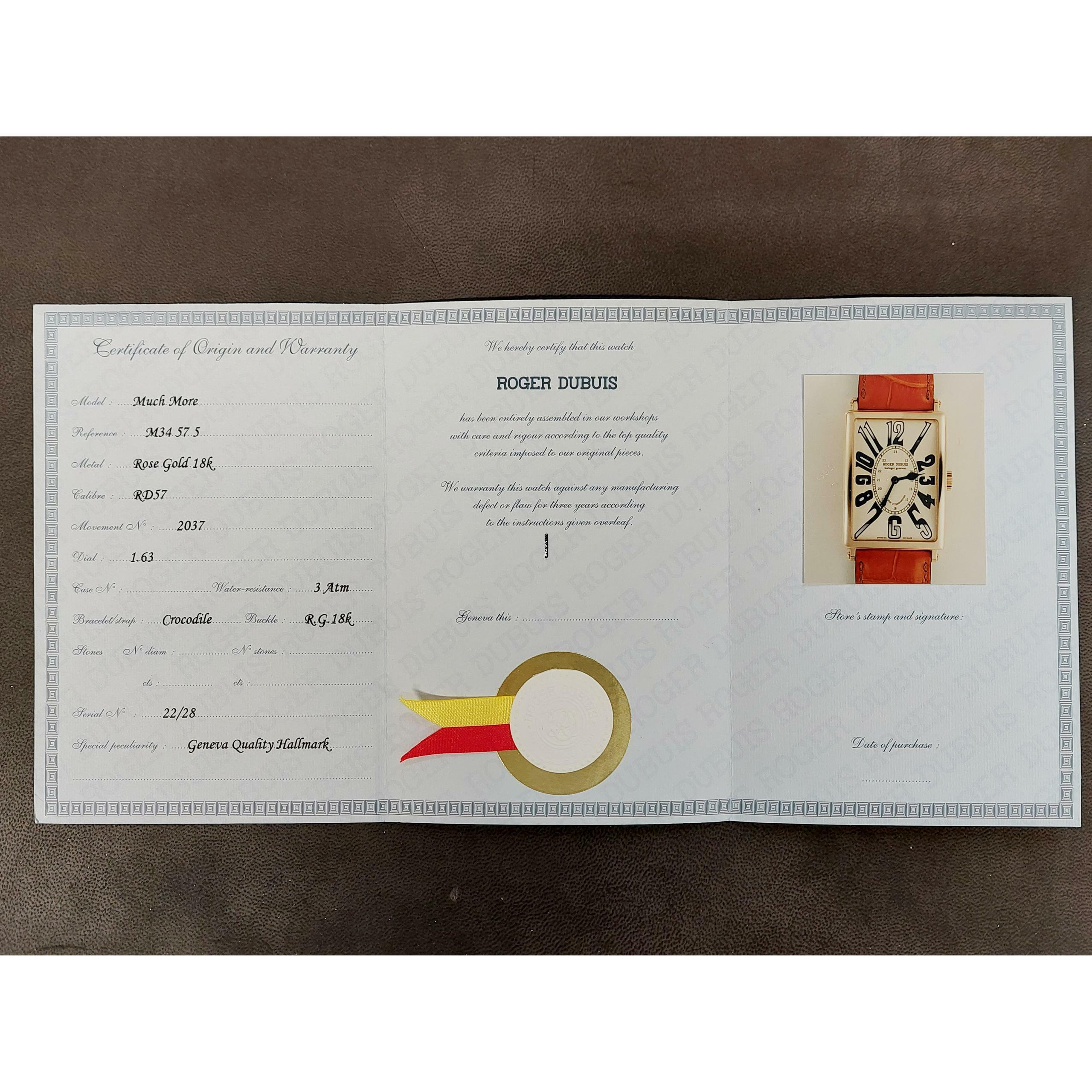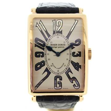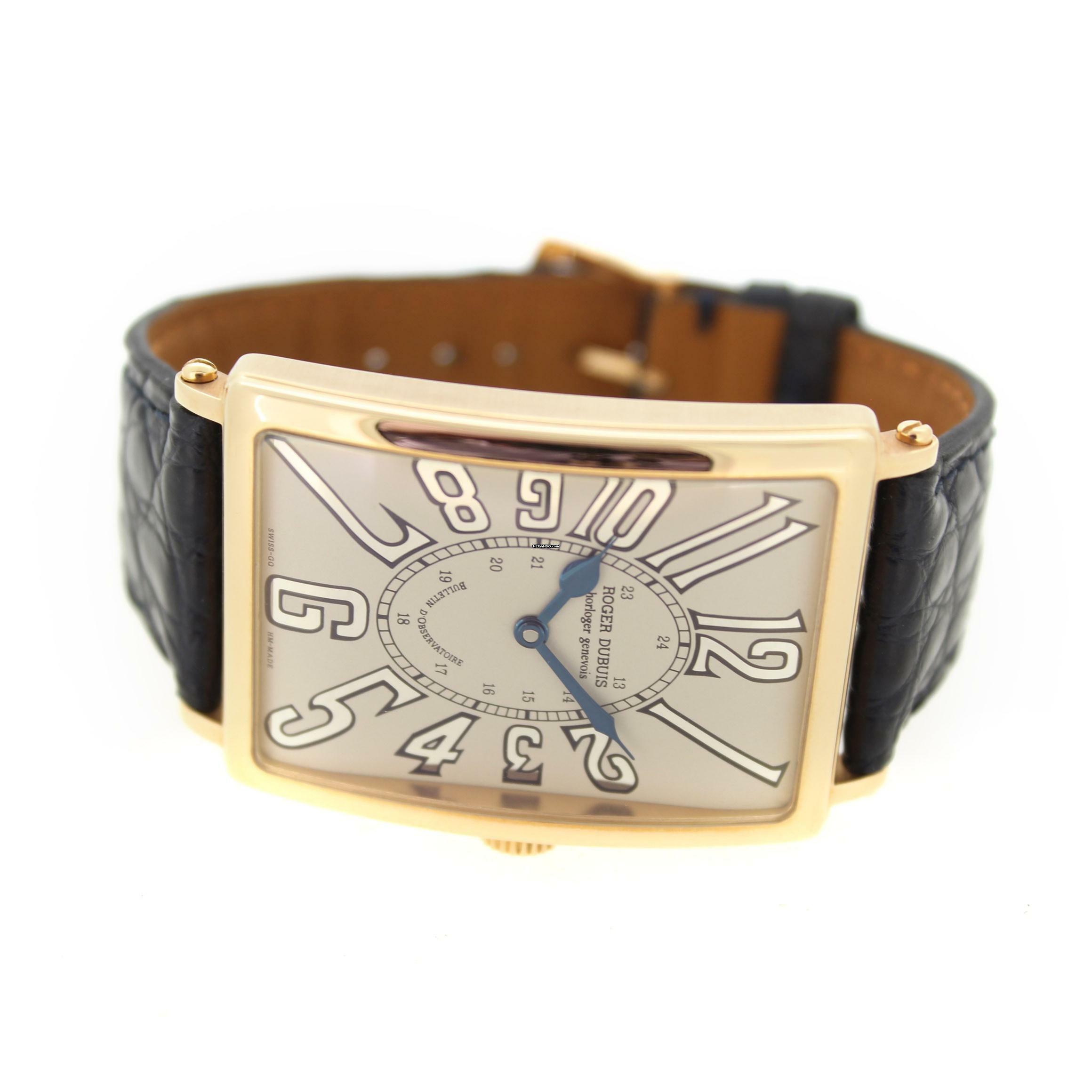 This Roger Dubuis watch features a 46mm rose gold case. The watch features a beige dial. The watch is equipped with a leather strap.
