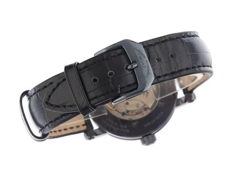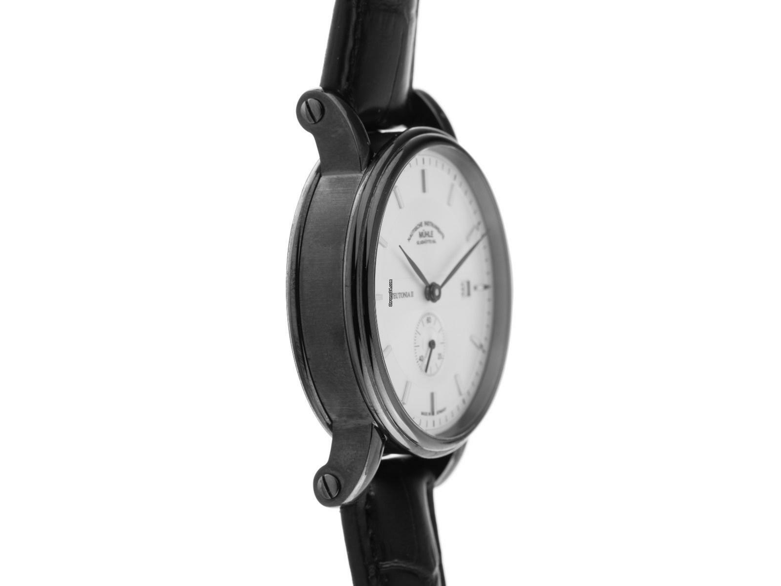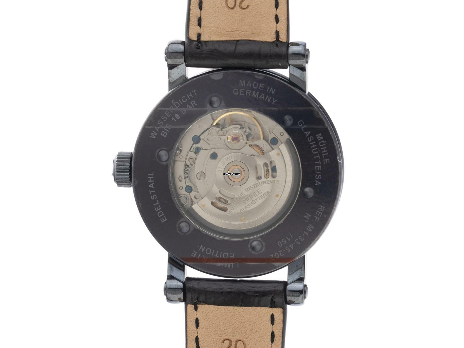 Mühle Glashütte Teutonia II Midnight Pearl Edition Stahl Automatik Armband Krokoleder Gehäuse Edelstahl schwarz beschichtet poliert und satiniert, Gehäusedurchmesser ohne Krone 41mm, Gehäusehöhe 13mm. Armband Krokoleder schwarz mit Ziernaht, Anstoßbreite 20mm, Stiftschließe Edelstahl schwarz beschichtet mit Hersteller-Logo. Zifferblatt silberfarben teilguillochiert mit aufgesetzten Edelstahl Indexen und schwarzen Zeigern. Uhrwerk Automatik, Kaliber SW 260-1 mit 31 Edelsteinen. Anzeige von Stunde und Minute über Zeiger aus der Mitte, kleine Sekunde mit Sekundenstopp zur sekundengenauen Einstellung der Uhrzeit bei 6 Uhr, Datumsanzeige mit Schnellverstellung bei 3 Uhr. Saphirglas kratzfest. Krone verschraubbar mit Hersteller-Logo. Boden Edelstahl verschraubt und graviert mit Saphirglas Sichtfenster. Gewicht der Uhr inklusive Armband 87g, Wasserdicht bis 10 ATM, Referenznummer: M1-33-45-202, ID: P197720001125H-2300, Artikelnummer: 10000083345. Mit Gangkontrolle und kompletter äußerlicher Aufarbeitung von November 2025. Original Mühle Glashütte Box mit Umkarton und Garantie Papiere von Juli 2023 sowie Beschreibung, Full Set. Limitiert auf 150 Exemplare. Ungetragen. Lieferzeit sofort. Inklusive Uhrenpass mit einem Farbbild, der genauen Beschreibung sowie dem Wiederbeschaffungswert der Uhr über 2300,-€ und 1000 Tage Garantie ab Kaufdatum.