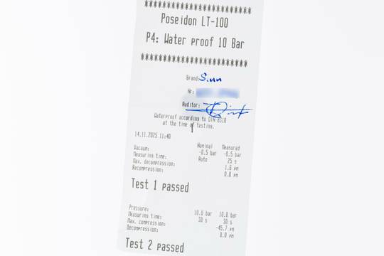 * Wenn die Uhr positiv auf Wasserdichtigkeit getestet wurde, dann gilt diese Eigenschaft zum Zeitpunkt der Messung. Wasserdichtigkeit ist nach DIN 8310 keine bleibende Eigenschaft. Sie sollte jährlich und vor besonderen Belastungen überprüft werden, da die eingebauten Dichtelemente in ihrer Funktion und im täglichen Gebrauch nachlassen. Einflüsse wie starke Temperaturschwankungen, Chlor, Seife oder Salzwasser wirken sich negativ auf die Wasserdichtigkeit aus.