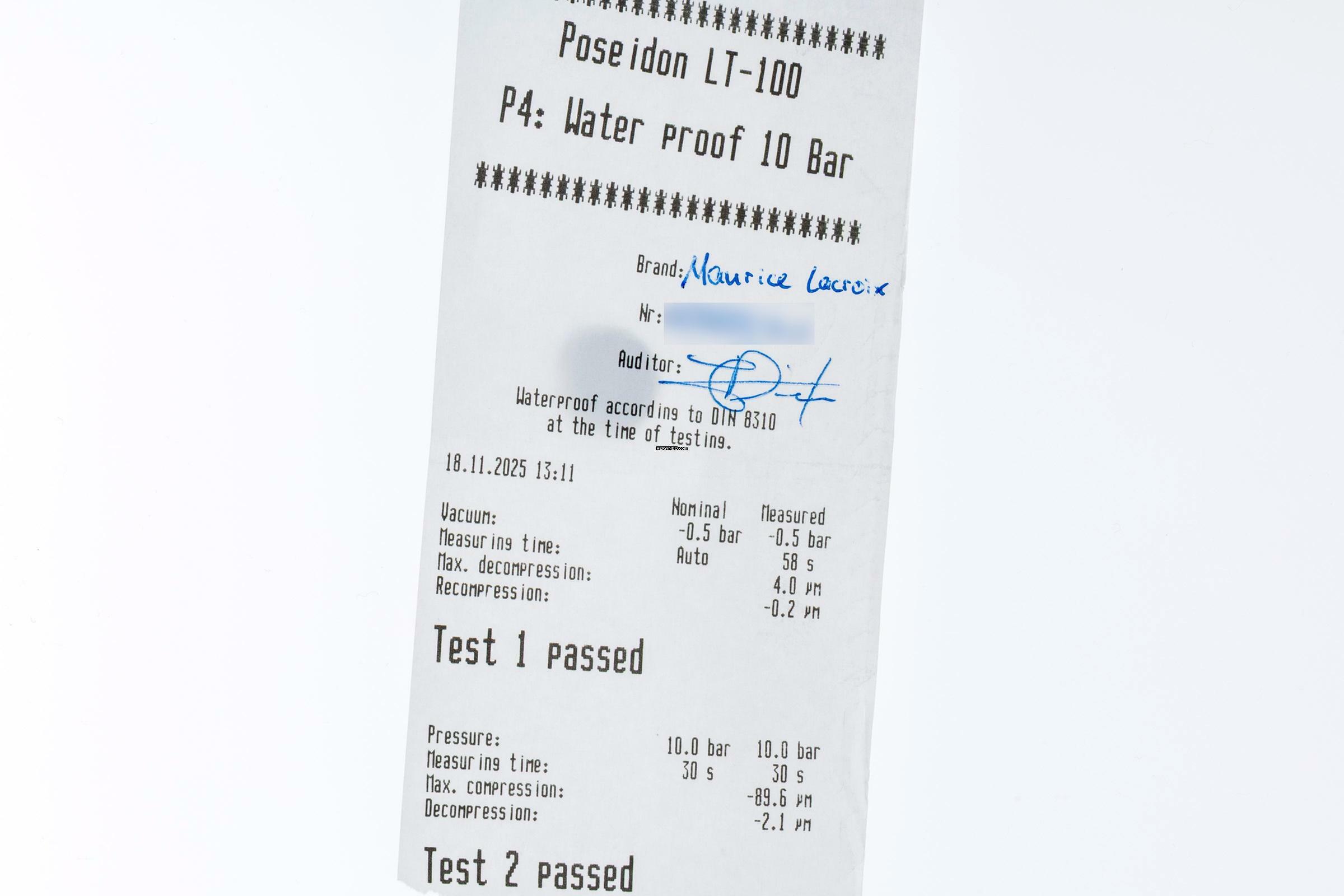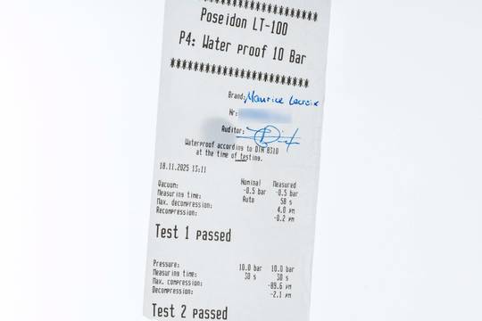 * Wenn die Uhr positiv auf Wasserdichtigkeit getestet wurde, dann gilt diese Eigenschaft zum Zeitpunkt der Messung. Wasserdichtigkeit ist nach DIN 8310 keine bleibende Eigenschaft. Sie sollte jährlich und vor besonderen Belastungen überprüft werden, da die eingebauten Dichtelemente in ihrer Funktion und im täglichen Gebrauch nachlassen. Einflüsse wie starke Temperaturschwankungen, Chlor, Seife oder Salzwasser wirken sich negativ auf die Wasserdichtigkeit aus.