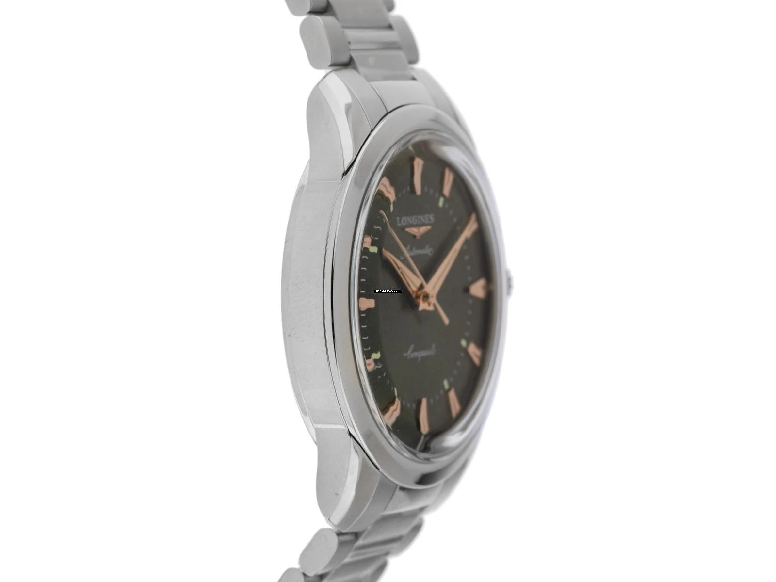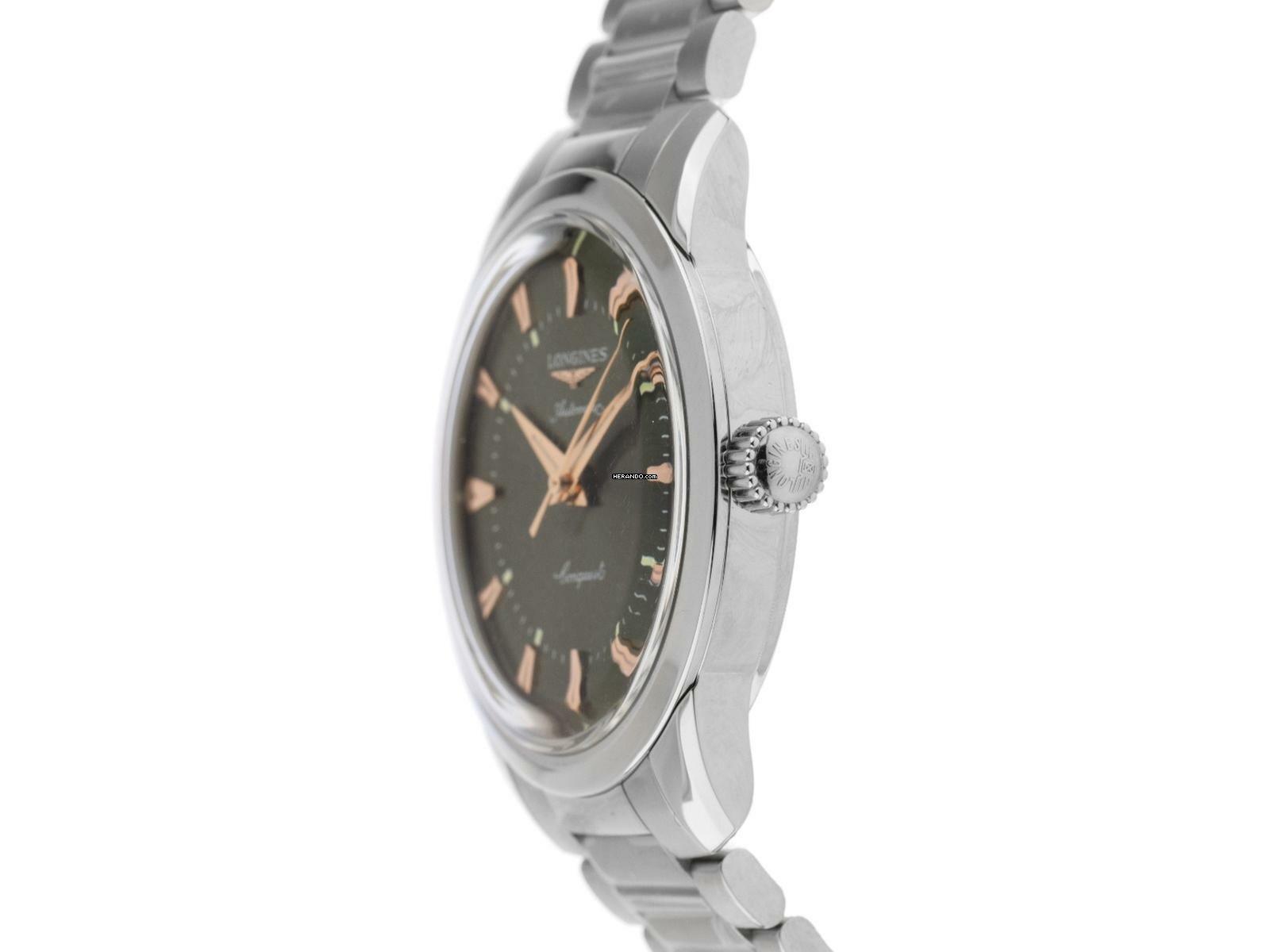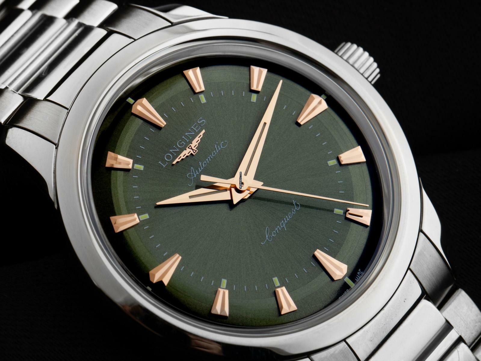 Longines Conquest Heritage Automatik Armband Stahl Gehäuse Edelstahl poliert, Gehäusedurchmesser ohne Krone 38mm, Gehäusehöhe 10,8mm. Lünette Edelstahl glatt und poliert. Armband Edelstahl poliert und satiniert, Sicherheitsfaltschließe Edelstahl mit Hersteller-Logo. Zifferblatt grün mit aufgesetzten roségoldenen Indexen und roségoldenen Leuchtzeigern. Uhrwerk Automatik, Kaliber Longines L888, Gangreserve ca. 72 Stunden, Anzeige von Stunde, Minute und Sekunde über Zeiger aus der Mitte. Saphirglas kratzfest. Krone geriffelt mit Hersteller-Logo. Boden Edelstahl verschraubt und graviert. Gewicht der Uhr inklusive Armband 126g, Länge des Armbandes inklusive Gehäuse 205mm. Referenznummer: L1.649.4.02.6, ID: ST610239601125HPP-3300, Artikelnummer: 10000083529. Original Longines Box mit Umkarton und Garantie Papiere von 2025 sowie Beschreibung, Full Set. Ungetragen. Lieferzeit sofort. Inklusive Uhrenpass mit einem Farbbild, der genauen Beschreibung sowie dem Wiederbeschaffungswert der Uhr über 3300,-€ und 1000 Tage Garantie ab Kaufdatum.