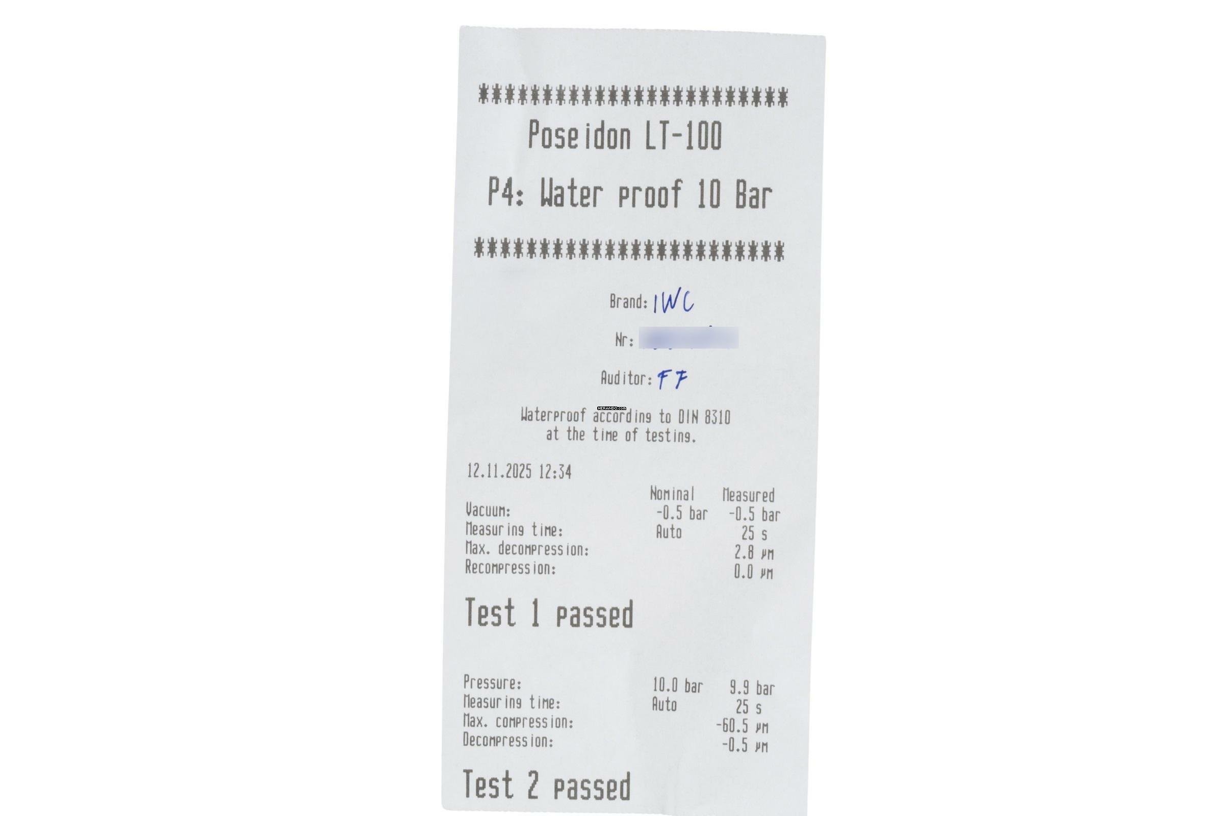 * Wenn die Uhr positiv auf Wasserdichtigkeit getestet wurde, dann gilt diese Eigenschaft zum Zeitpunkt der Messung. Wasserdichtigkeit ist nach DIN 8310 keine bleibende Eigenschaft. Sie sollte jährlich und vor besonderen Belastungen überprüft werden, da die eingebauten Dichtelemente in ihrer Funktion und im täglichen Gebrauch nachlassen. Einflüsse wie starke Temperaturschwankungen, Chlor, Seife oder Salzwasser wirken sich negativ auf die Wasserdichtigkeit aus.