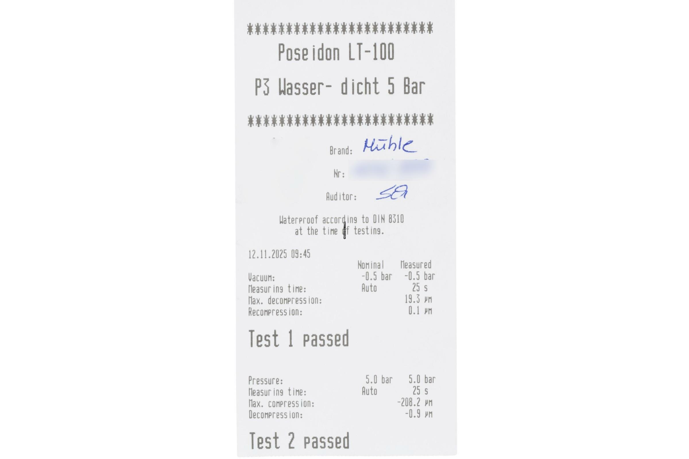 * Wenn die Uhr positiv auf Wasserdichtigkeit getestet wurde, dann gilt diese Eigenschaft zum Zeitpunkt der Messung. Wasserdichtigkeit ist nach DIN 8310 keine bleibende Eigenschaft. Sie sollte jährlich und vor besonderen Belastungen überprüft werden, da die eingebauten Dichtelemente in ihrer Funktion und im täglichen Gebrauch nachlassen. Einflüsse wie starke Temperaturschwankungen, Chlor, Seife oder Salzwasser wirken sich negativ auf die Wasserdichtigkeit aus.