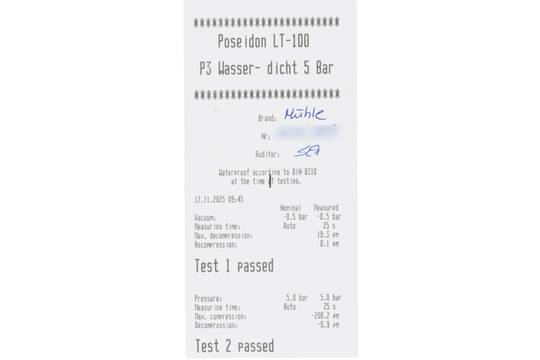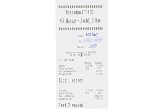 - Wasserdichtigkeit*: ja. Das Prüfprotokoll mit Prüfdruckangabe liegt bei.