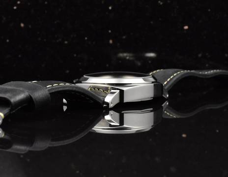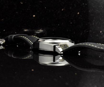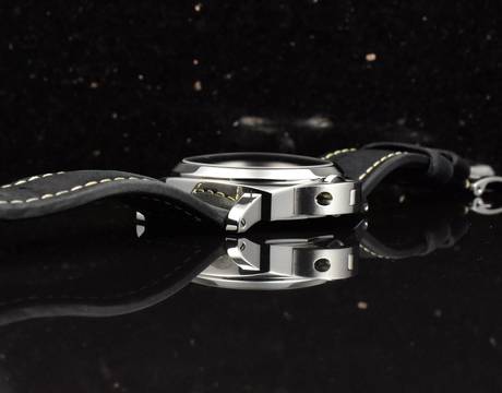 Gehäuse: massives unpoliertes Stahl Gehäuse, Saphirglas, 44mm Durchmesser; Graues / Schwarzes Matt Ziffernblatt
