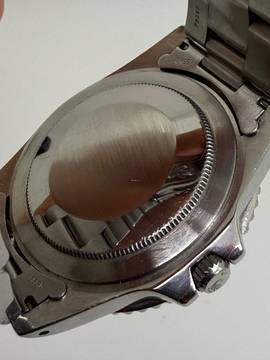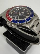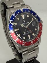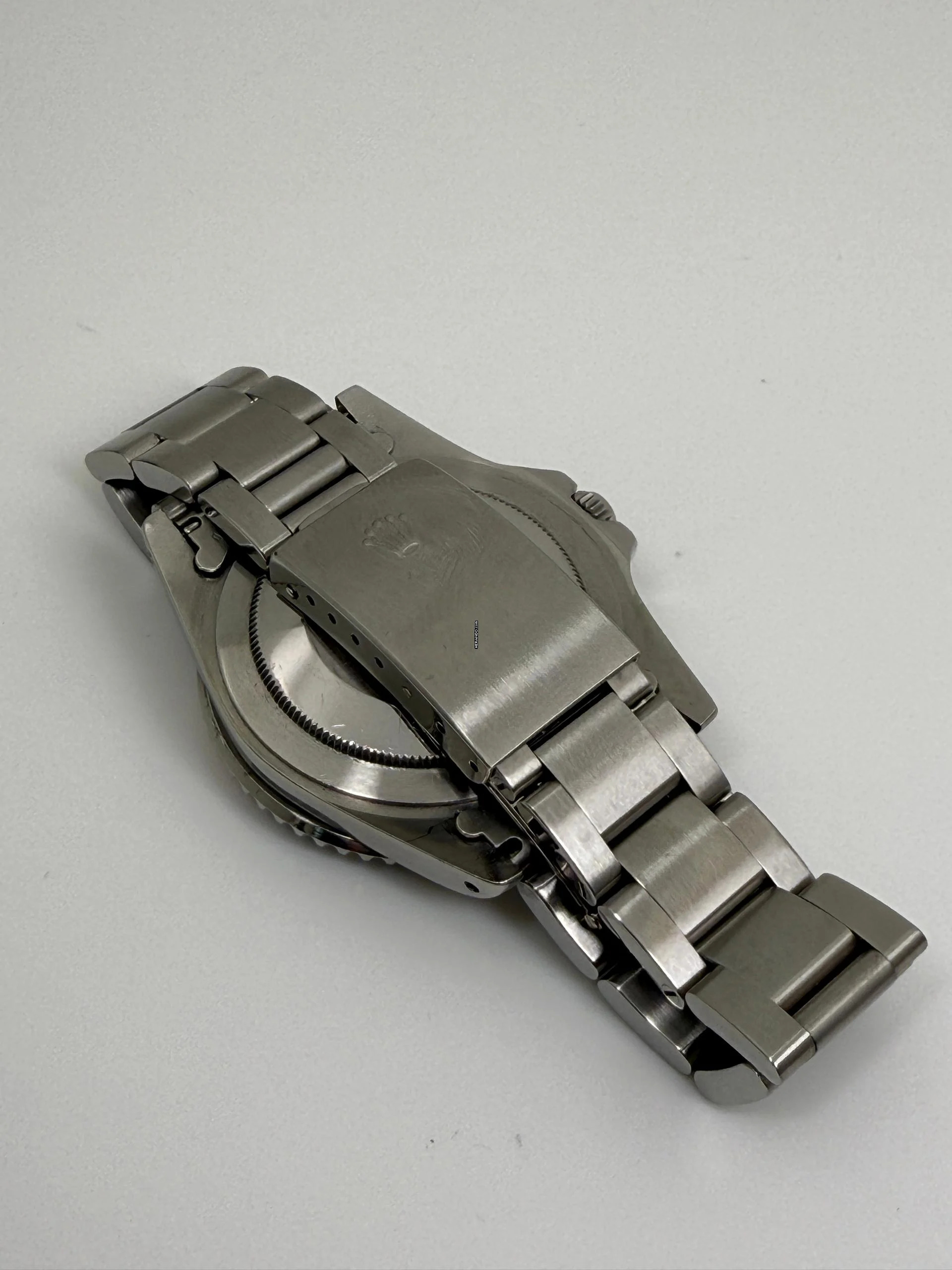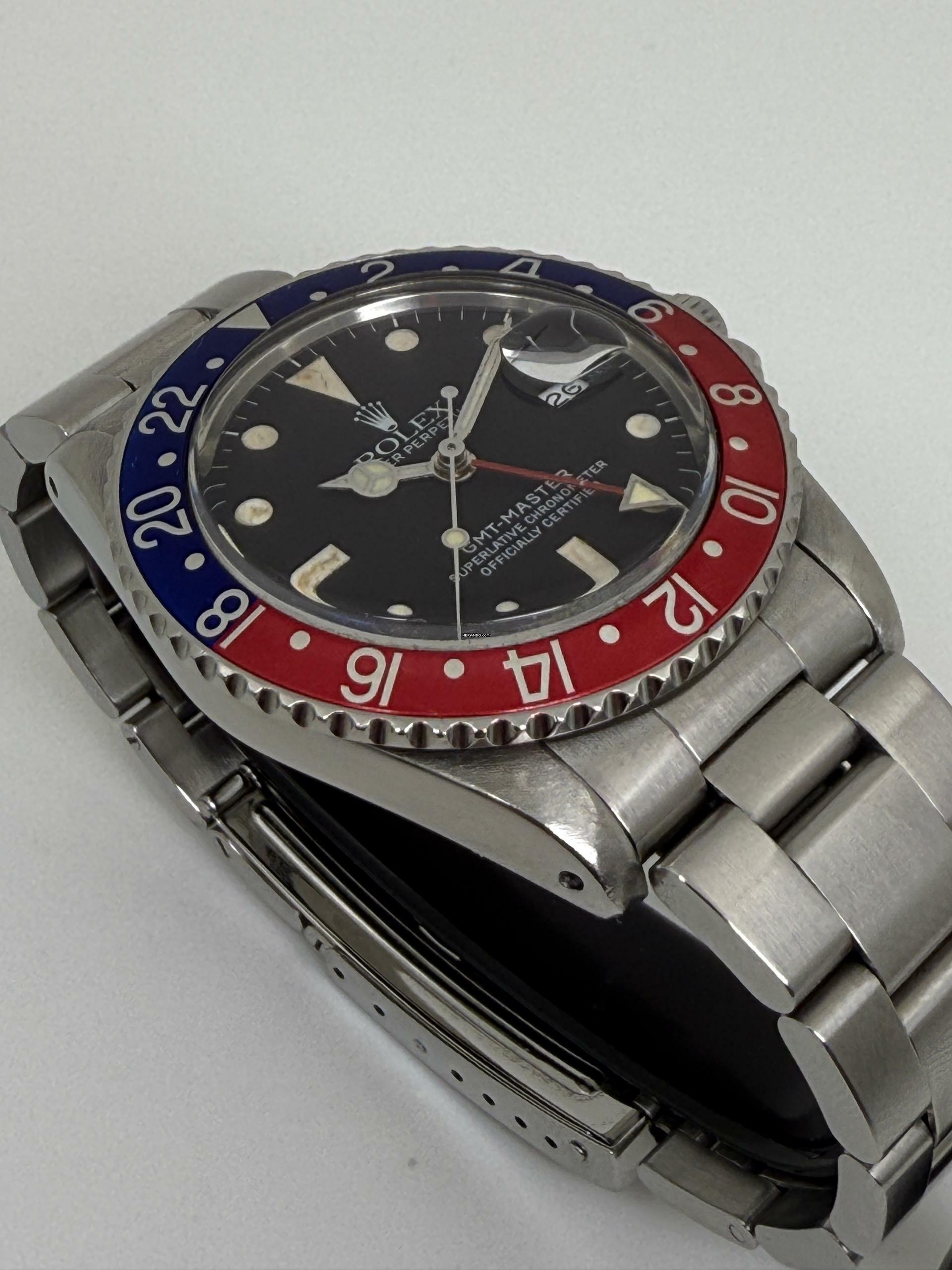 Wir haben hier eine Rolex 16750 GMT-Master „Transitional” mit originalem, zeitgemäßem mattem Zifferblatt und Quickset-Datumsfunktion.