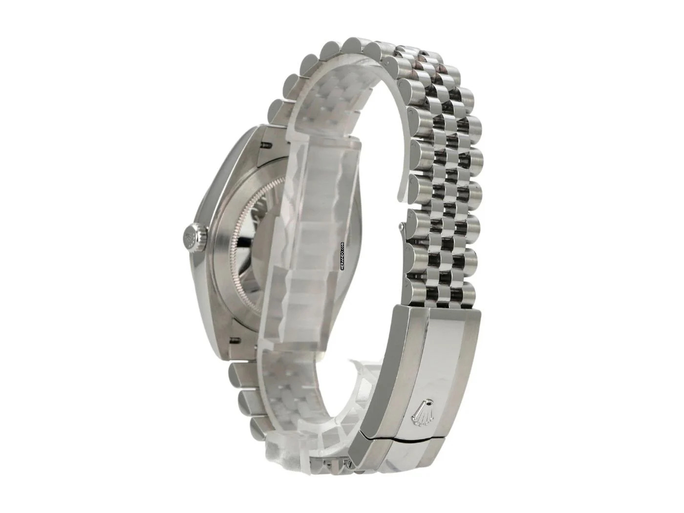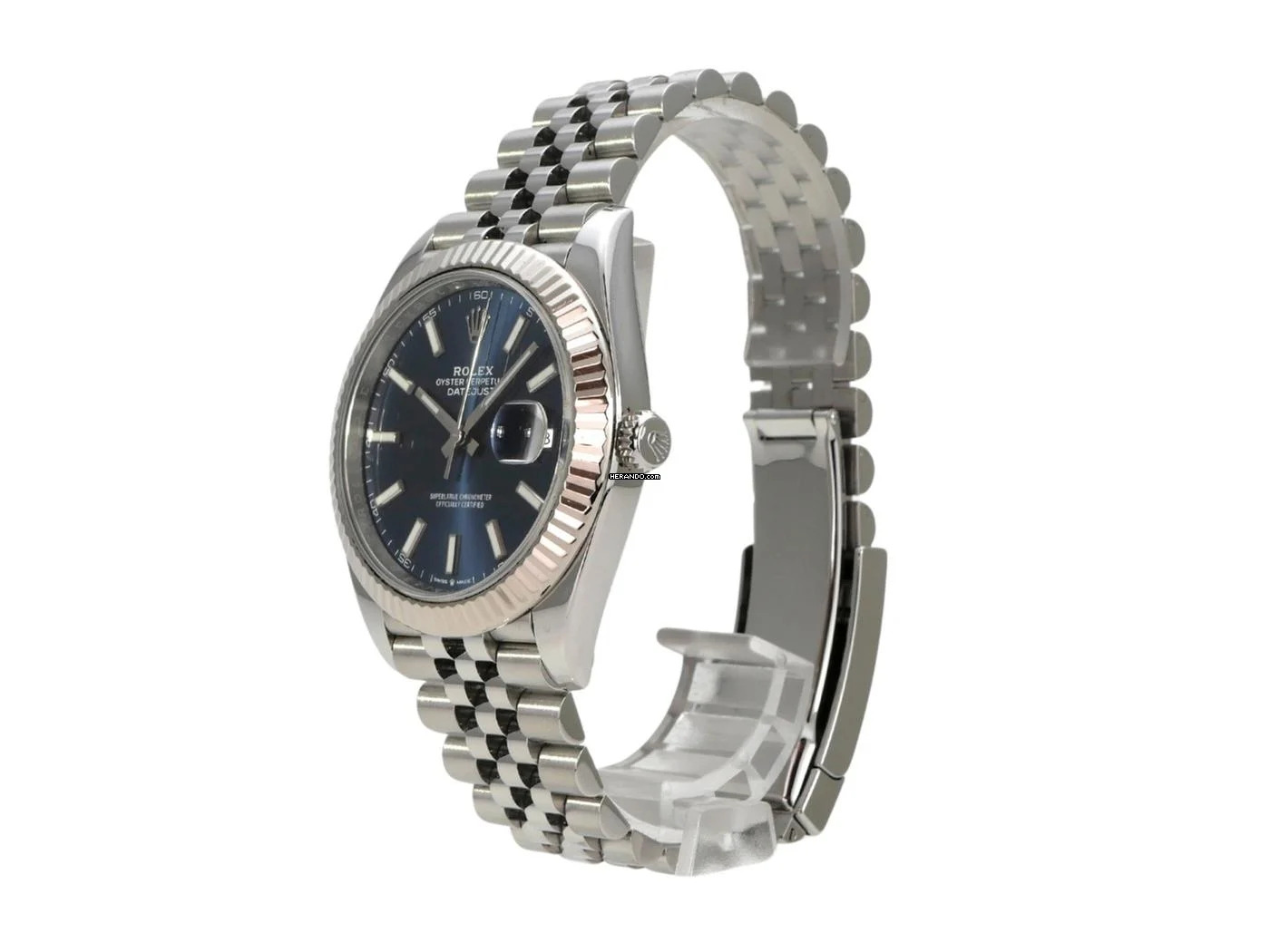 Gehäuse aus Edelstahl poliert und satiniert, Gehäusedurchmesser 41 mm, geriffelte 18 kt Weißgold Lünette, Jubile Armband aus Edelstahl poliert und satiniert mit Faltschließe, blaues Zifferblatt mit 18 kt Weißgold Leuchtindizes, Leuchtzeiger, Automatikwerk, Rolex Manufakturkaliber 3235, 70 Stunden Gangreserve, Datumsanzeige, Chronometer, kratzfestes Saphirglas, verschraubte Krone, Edelstahlboden verschraubt, wasserdicht bis zu 10 bar.