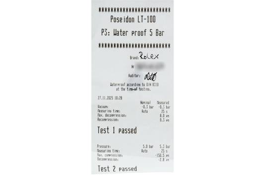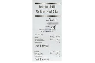 * Wenn die Uhr positiv auf Wasserdichtigkeit getestet wurde, dann gilt diese Eigenschaft zum Zeitpunkt der Messung. Wasserdichtigkeit ist nach DIN 8310 keine bleibende Eigenschaft. Sie sollte jährlich und vor besonderen Belastungen überprüft werden, da die eingebauten Dichtelemente in ihrer Funktion und im täglichen Gebrauch nachlassen. Einflüsse wie starke Temperaturschwankungen, Chlor, Seife oder Salzwasser wirken sich negativ auf die Wasserdichtigkeit aus.